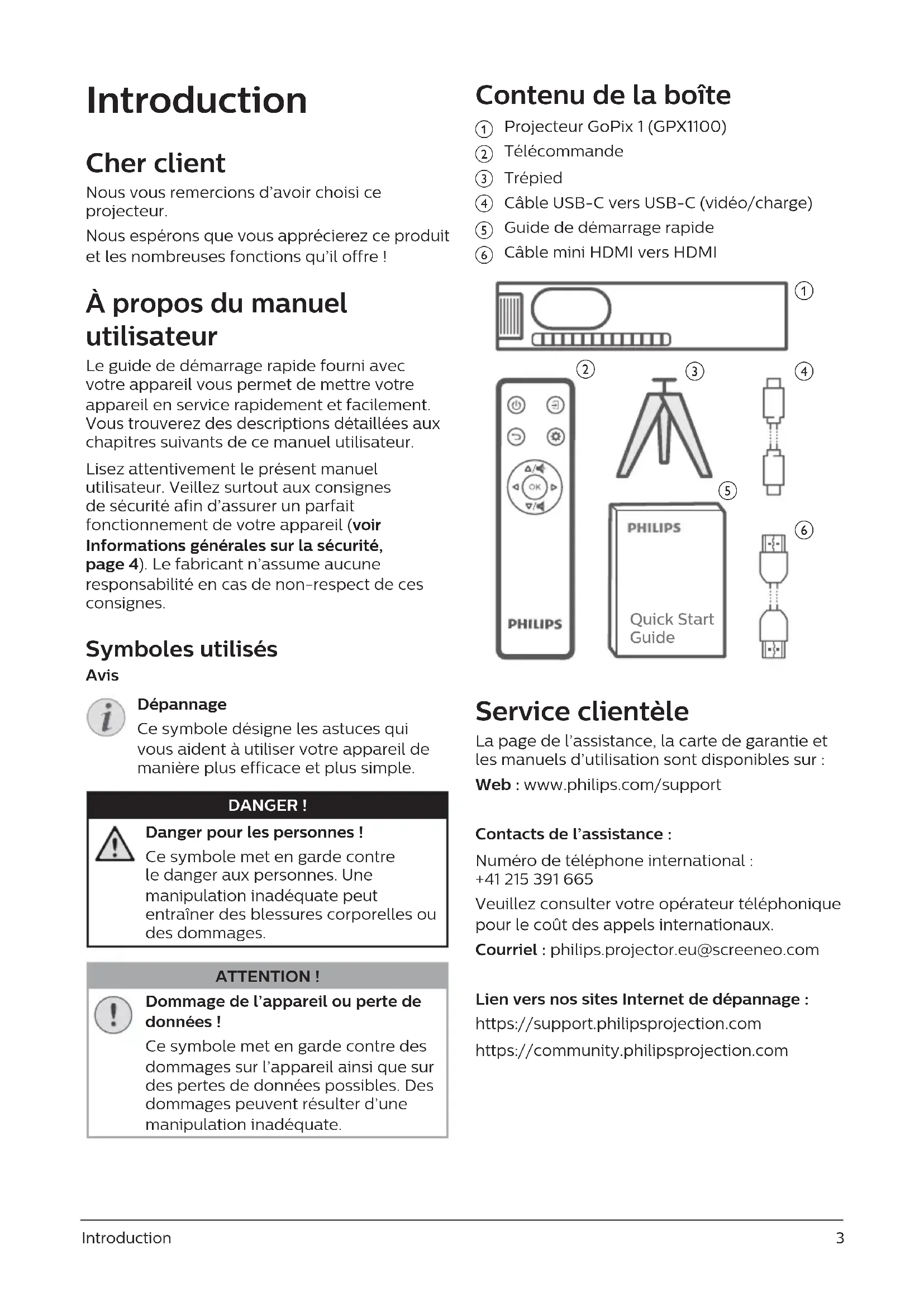 - Manuel utilisateur Enregistrez votre produit et obtenez de l’aide sur www.philips.com/support Portable projector GPX1100 GoPix 1Introduction 3 Cher client p. 3
