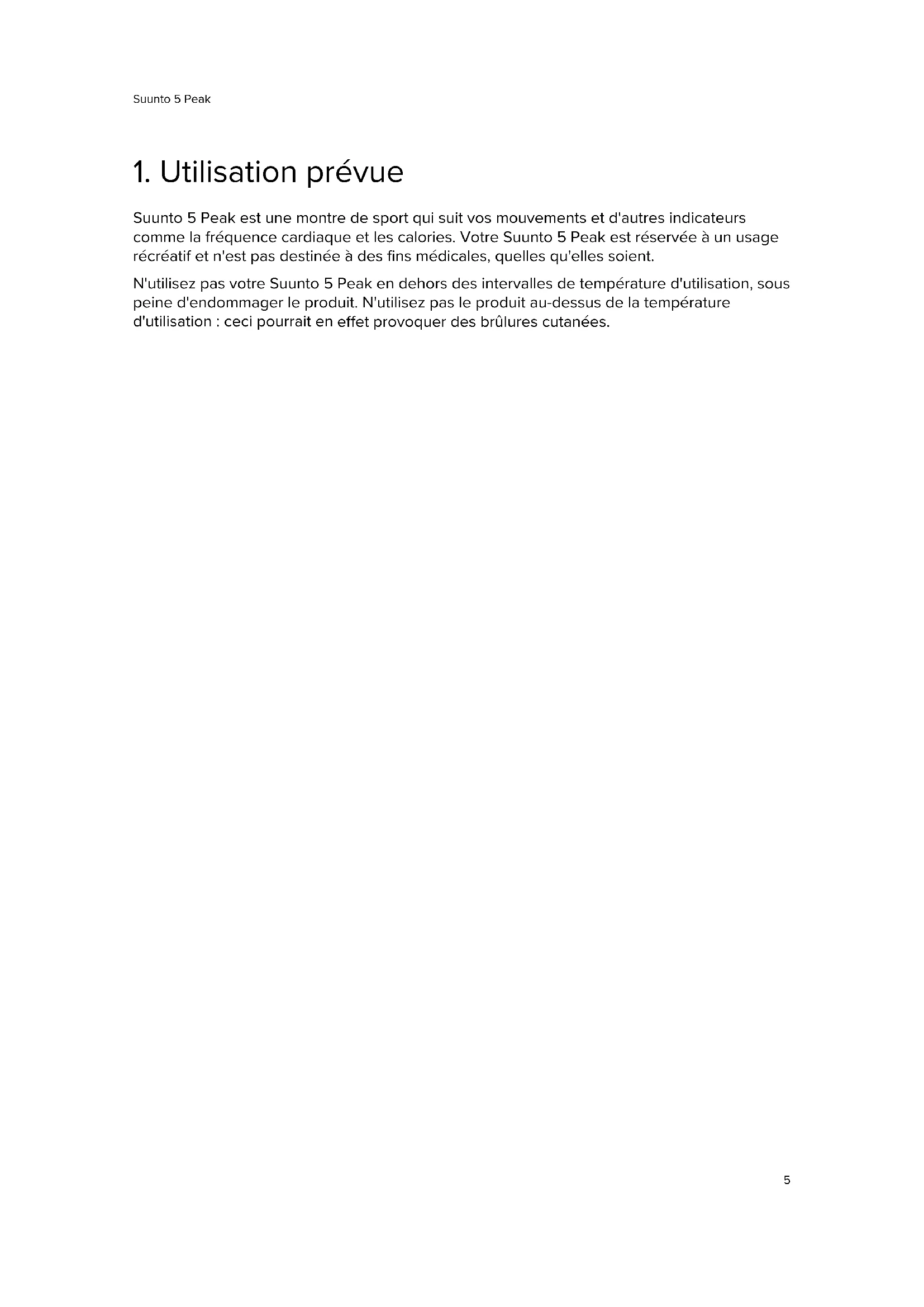 Suunto 5 Peak est une montre de sport qui suit vos mouvements et d'autres indicateurs comme la fréquence cardiaque et les calories. Votre Suunto 5 Peak est réservée à un usage récréatif et n'est pas destinée à des fins médicales, quelles qu'elles soient. N'utilisez pas votre Suunto 5 Peak en dehors des intervalles de température d'utilisation, sous peine d'endommager le produit. N'utilisez pas le produit au-dessus de la température d'utilisation : ceci pourrait en eet provoquer des brûlures cutanées. Suunto 5 Peak