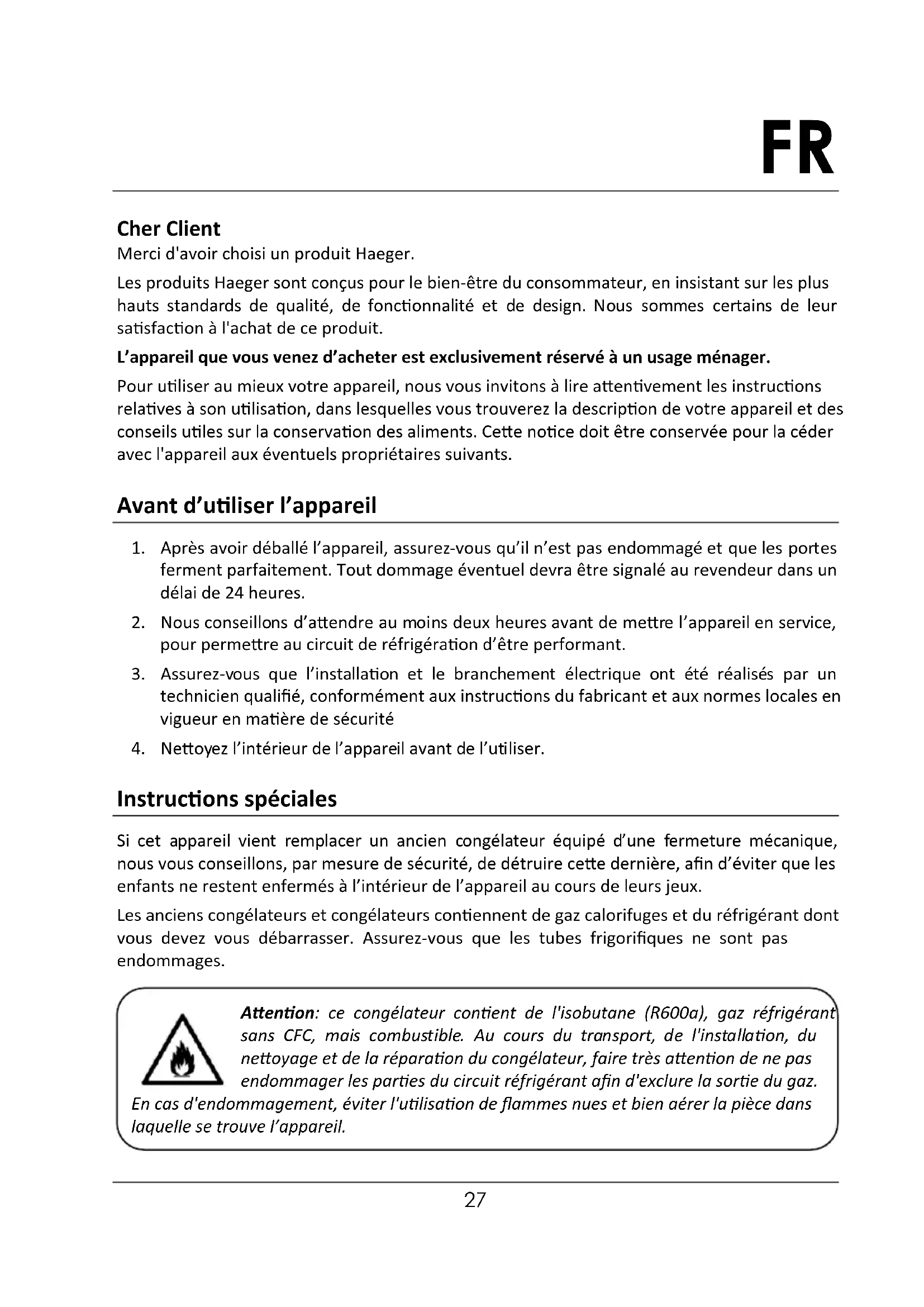 Cher Client Merci d'avoir choisi un produit Haeger. Les produits Haeger sont conçus pour le bien-être du consommateur, en insistant sur les plus hauts standards de qualité, de fonctionnalité et de design. Nous sommes certains de leur satisfaction à l'achat de ce produit. L’appareil que vous venez d’acheter est exclusivement réservé à un usage ménager. Pour utiliser au mieux votre appareil, nous vous invitons à lire attentivement les instructions relatives à son utilisation, dans lesquelles vous trouverez la description de votre appareil et des conseils utiles sur la conservation des aliments. Cette notice doit être conservée pour la céder avec l'appareil aux éventuels propriétaires suivants. Avant d’utiliser l’appareil