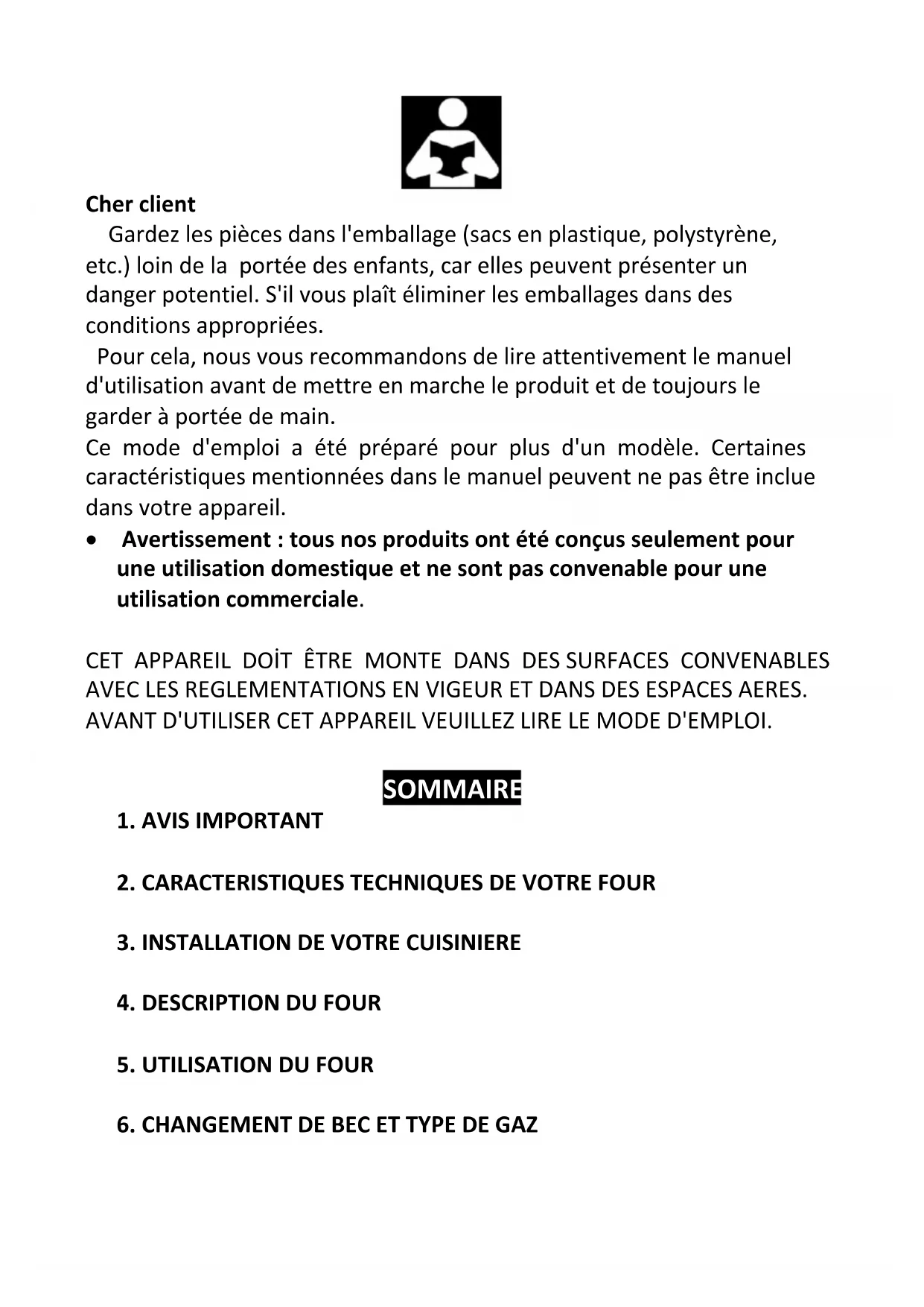 - Avertissement : tous nos produits ont été conçus seulement pour une utilisation domestique et ne sont pas convenable pour une utilisation commerciale. CET APPAREIL DOİT ÊTRE MONTE DANS DES SURFACES CONVENABLES AVEC LES REGLEMENTATIONS EN VIGEUR ET DANS DES ESPACES AERES. AVANT D'UTILISER CET APPAREIL VEUILLEZ LIRE LE MODE D'EMPLOI. SOMMAIRE