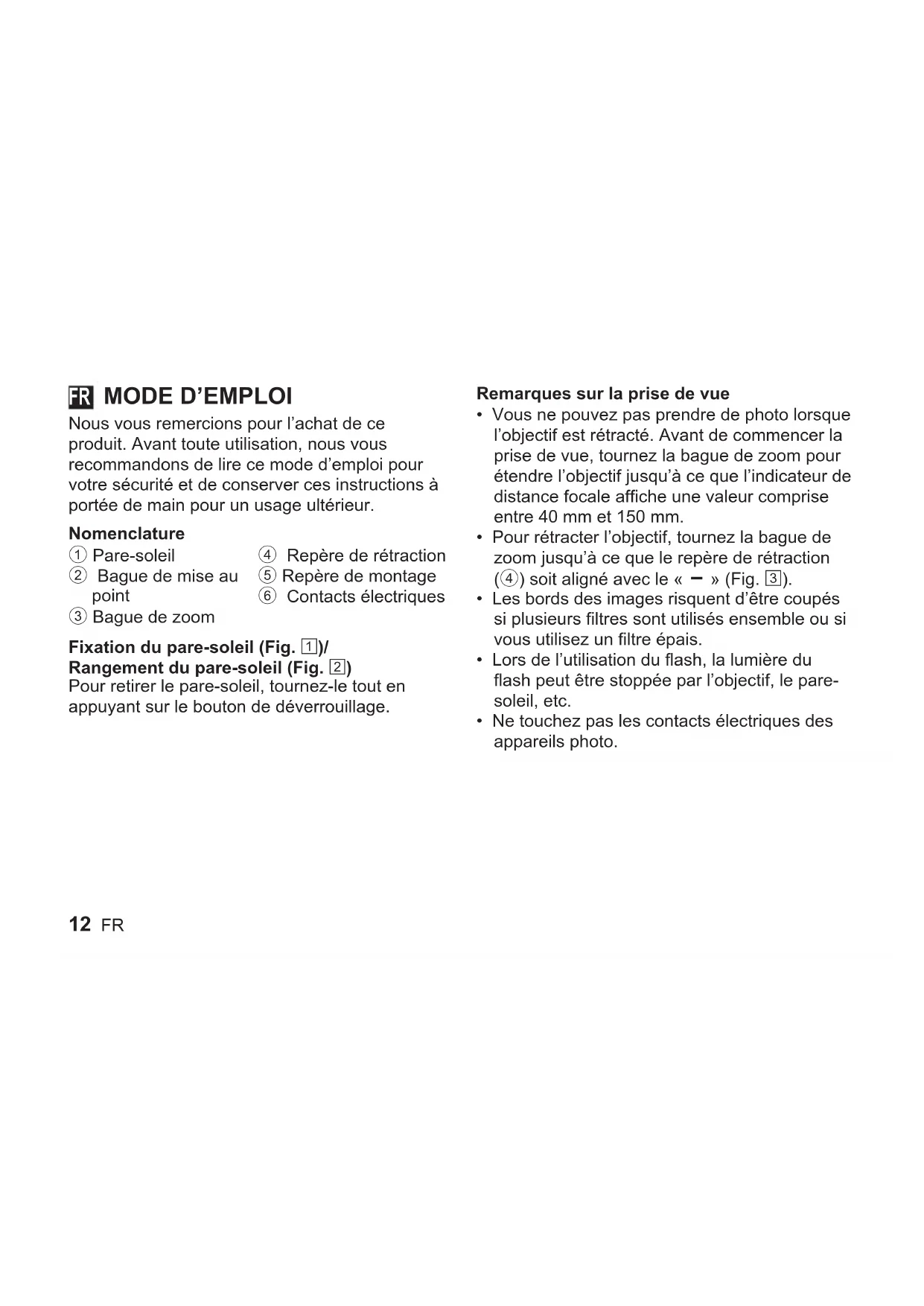 - Ne touchez pas les contacts électriques des appareils photo. FRFR 13 Caractéristiques principales Monture : monture Micro Four Thirds Longueur focale : 40 mm à 150 mm (équivalent à 80 mm à 300 mm sur un appareil photo 35 mm) Ouverture maximale : F4,0 Angle de vue : 30° à 8,2° Configuration de l’objectif : 9 groupes, 15 lentilles Commande de diaphragme : F4,0 à F22 Plage de prise de vue : 0,7 m à ) (infini) Réglage de la mise au point : Commutation AF/MF Dimensions : ⌀ 68,9 mm (diamètre maximal) × 99,4 mm (longueur) Poids : 382 g (pare-soleil et bouchon exclus) Taille du filtre : ⌀ 62 mm Pare-soleil : Baïonnette