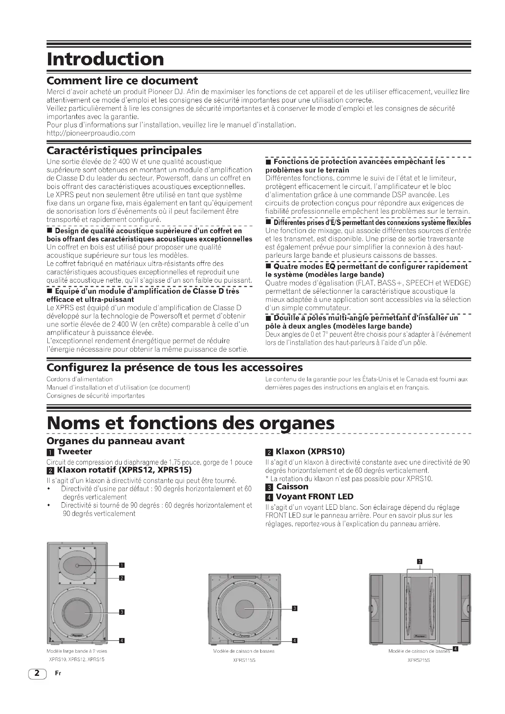 Introduction Comment lire ce document Merci d’avoir acheté un produit Pioneer DJ. Afin de maximiser les fonctions de cet appareil et de les utiliser efficacement, veuillez lire attentivement ce mode d’emploi et les consignes de sécurité importantes pour une utilisation correcte. Veillez particulièrement à lire les consignes de sécurité importantes et à conserver le mode d’emploi et les consignes de sécurité importantes avec la garantie. Pour plus d’informations sur l’installation, veuillez lire le manuel d’installation. http://pioneerproaudio.com Une sortie élevée de 2 400 W et une qualité acoustique supérieure sont obtenues en montant un module d’amplification de Classe D du leader du secteur, Powersoft, dans un coffret en bois offrant des caractéristiques acoustiques exceptionnelles. Le XPRS peut non seulement être utilisé en tant que système fixe dans un organe fixe, mais également en tant qu’équipement de sonorisation lors d’événements où il peut facilement être transporté et rapidement configuré.