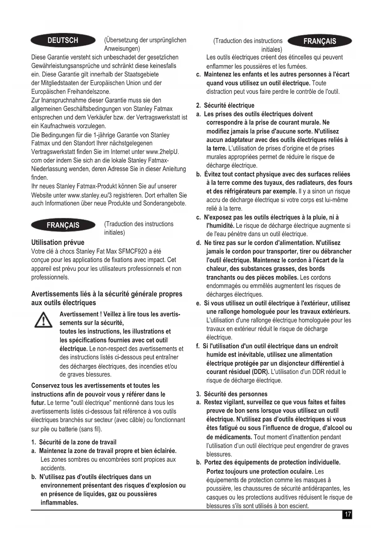 Déclaration de conformité CE DIRECTIVES MACHINES Clé à chocs sans l - SFMCF920 STANLEY FATMAX déclare que les produits décrits dans les « Caractéristiques techniques » sont conformes aux normes EN62841-1:2015, EN62841-2-2: 2014. Ces produits sont également conformes aux Directives 2006/42/CE, 2014/30/UE et 2011/65/UE. Pour obtenir plus de précisions, veuillez contacter STANLEY FATMAX à l'adresse suivante ou vous reporter au dos du manuel. Pour obtenir plus de précisions, veuillez contacter STANLEY FATMAX à l'adresse suivante ou vous reporter au dos du manuel. Le soussigné est responsable de la compilation du dossier technique et il fait cette déclaration au nom de STANLEY FATMAX. Patrick Diepenbach General Manager, Benelux STANLEY FATMAX, Egide Walschaertsstraat 14-18 2800 Mechelen, Belgique 19/04/2021 Garantie Stanley Fat Max est sûr de la qualité de ses produits et offre une garantie de 12 mois à ses clients, à partir de la date d'achat. Cette garantie s'ajoute à vos droits légaux auxquels elle ne porte aucunement préjudice. Cette garantie est valable au sein des territoires des états membres de l’Union européenne et au sein de la zone européenne de libre- échange. Pour prétendre à la garantie, la réclamation doit être en conformité avec les conditions générales de Stanley Fat Max et vous devez fournir une preuve d'achat au vendeur ou au réparateur agréé. Les conditions générales de la garantie de 1 an Stanley Fat Max ainsi que l'adresse du réparateur agrée le plus proche sont disponibles sur le site Internet www.2helpU.com ou en contactant votre agence Stanley Fat Max locale à l'adresse indiquée dans ce manuel. Visitez notre site Internet www.stanley.eu/3 pour enregistrer votre nouveau produit Stanley Fat Max et pour être tenu informé des nouveaux produits et offres spéciales. Uso previsto L’avvitatore/chiave battente Stanley Fat Max SFMCF920 è stato progettato per applicazioni di avvitatura a impatto. Questo apparecchio è concepito per uso professionale e privato e per utenti non professionisti. Avvertenze di sicurezza generali per gli elettroutensili Avvertenza! Leggere tutte le avvertenze di sicurezza, le istruzioni, le illustrazioni e le speciche fornite con l’elettroutensile. La mancata osservanza delle avvertenze e istruzioni elencate di seguito potrebbe dar luogo a scosse elettriche, incendi e/o lesioni personali gravi. Conservare tutte le avvertenze e le istruzioni per riferimenti futuri. Il termine "elettroutensile" utilizzato in tutte le avvertenze elencate di seguito fa riferimento sia agli utensili alimentati tramite una rete elettrica (con cavo) che agli utensili elettrici a batteria (senza cavo).