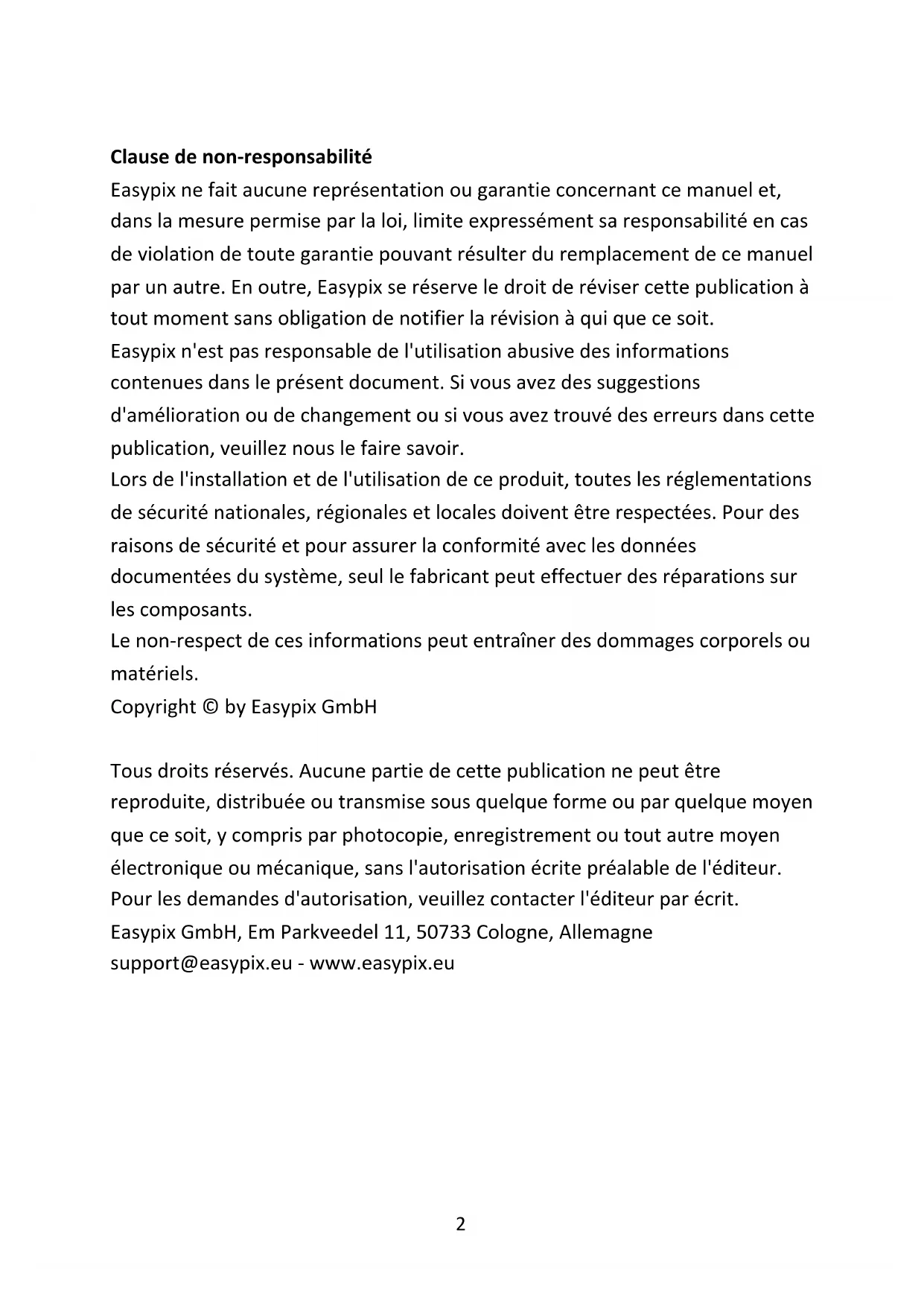 - Déclaration de conformité Clause de non-responsabilité Easypix ne fait aucune représentation ou garantie concernant ce manuel et, dans la mesure permise par la loi, limite expressément sa responsabilité en cas de violation de toute garantie pouvant résulter du remplacement de ce manuel par un autre. En outre, Easypix se réserve le droit de réviser cette publication à tout moment sans obligation de notifier la révision à qui que ce soit. Easypix n'est pas responsable de l'utilisation abusive des informations contenues dans le présent document. Si vous avez des suggestions d'amélioration ou de changement ou si vous avez trouvé des erreurs dans cette publication, veuillez nous le faire savoir. Lors de l'installation et de l'utilisation de ce produit, toutes les réglementations de sécurité nationales, régionales et locales doivent être respectées. Pour des raisons de sécurité et pour assurer la conformité avec les données documentées du système, seul le fabricant peut effectuer des réparations sur les composants. Le non-respect de ces informations peut entraîner des dommages corporels ou matériels. Copyright © by Easypix GmbH Tous droits réservés. Aucune partie de cette publication ne peut être reproduite, distribuée ou transmise sous quelque forme ou par quelque moyen que ce soit, y compris par photocopie, enregistrement ou tout autre moyen électronique ou mécanique, sans l'autorisation écrite préalable de l'éditeur. Pour les demandes d'autorisation, veuillez contacter l'éditeur par écrit. Easypix GmbH, Em Parkveedel 11, 50733 Cologne, Allemagne support@easypix.eu - www.easypix.eu3 Informations générales Lisez ce manuel et ses instructions de sécurité avant d'utiliser ce produit. Suivez toutes les instructions. Cela permettra d'éviter les dangers qui pourraient entraîner des dommages matériels et/ou des blessures graves. Le produit ne peut être utilisé que par des personnes qui ont lu et compris entièrement le contenu de ce manuel d'utilisation. Assurez-vous que chaque personne qui utilise le produit a lu et respecte ces avertissements et instructions. Conservez toutes les informations et instructions de sécurité pour référence ultérieure et transmettez-les aux utilisateurs ultérieurs du produit. Le fabricant n'est pas responsable des dommages matériels ou corporels résultant d'une mauvaise manipulation ou du non-respect des consignes de sécurité. Symboles L'avertissement indique un danger à risque moyen qui, s'il n'est pas évité, peut entraîner des blessures. p. 292