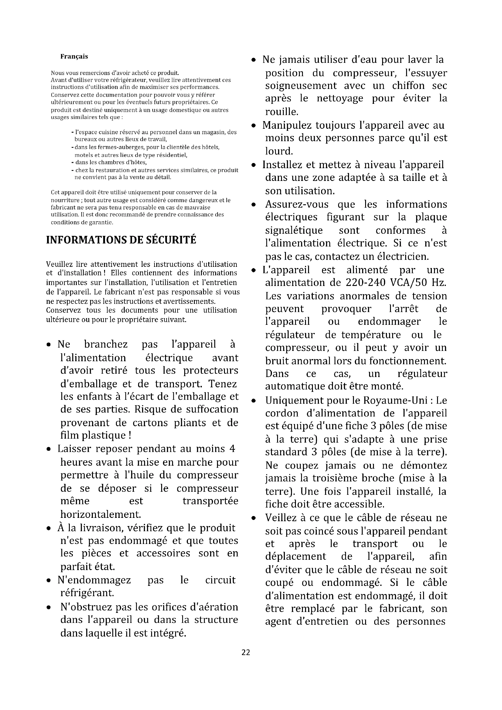 - L'appareil est alimenté par une alimentation de 220-240 VCA/50 Hz. Les variations anormales de tension peuvent provoquer l'arrêt de l'appareil ou endommager le régulateur de température ou le compresseur, ou il peut y avoir un bruit anormal lors du fonctionnement. Dans ce cas, un régulateur automatique doit être monté.