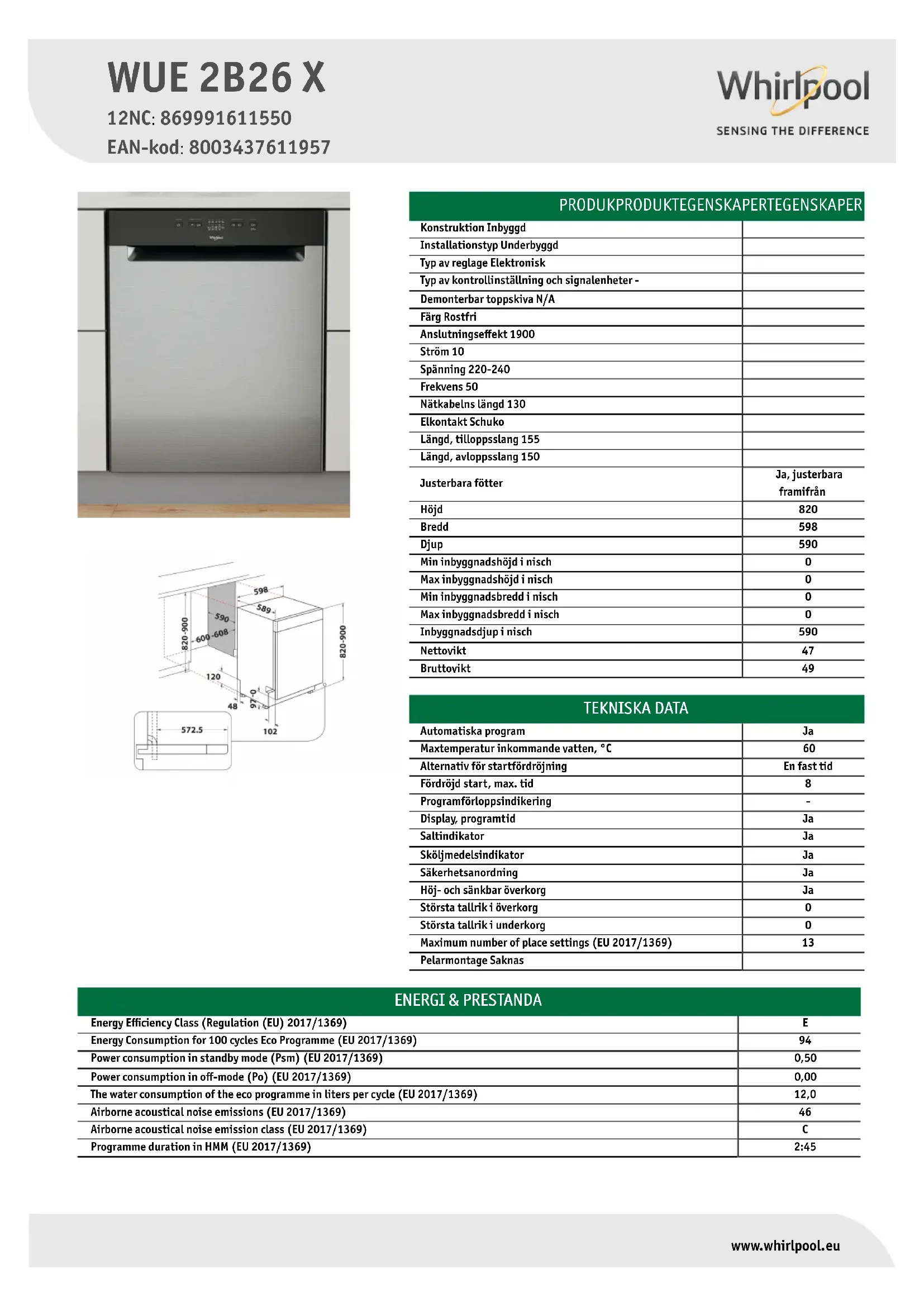 WUE 2B26 X - Lave-vaisselle WHIRLPOOL - Notice d'utilisation et mode d'emploi gratuit