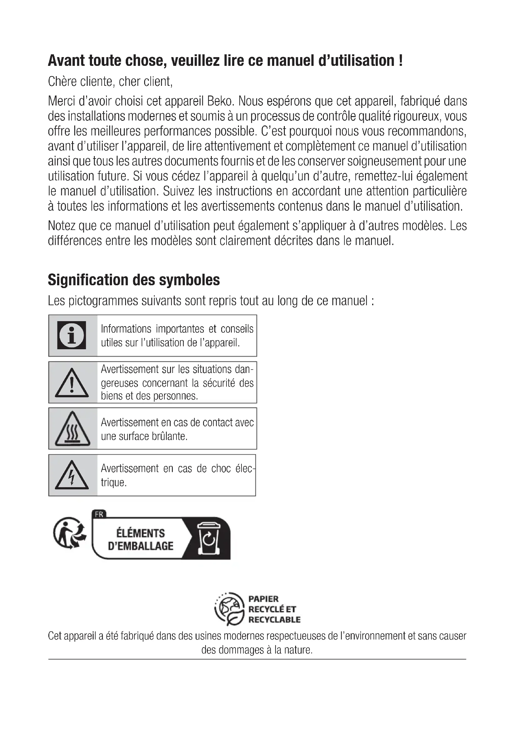 ITALIANO 19-35 ČESKY 36-53 POLSKI 54-72 ROMÂNĂ 73-93Avant toute chose, veuillez lire ce manuel d’utilisation ! Chère cliente, cher client, Merci d’avoir choisi cet appareil Beko. Nous espérons que cet appareil, fabriqué dans des installations modernes et soumis à un processus de contrôle qualité rigoureux, vous offre les meilleures performances possible. C’est pourquoi nous vous recommandons, avant d’utiliser l’appareil, de lire attentivement et complètement ce manuel d’utilisation ainsi que tous les autres documents fournis et de les conserver soigneusement pour une utilisation future. Si vous cédez l’appareil à quelqu’un d’autre, remettez-lui également le manuel d’utilisation. Suivez les instructions en accordant une attention particulière à toutes les informations et les avertissements contenus dans le manuel d’utilisation. Notez que ce manuel d’utilisation peut également s’appliquer à d’autres modèles. Les différences entre les modèles sont clairement décrites dans le manuel. Signification des symboles Les pictogrammes suivants sont repris tout au long de ce manuel :