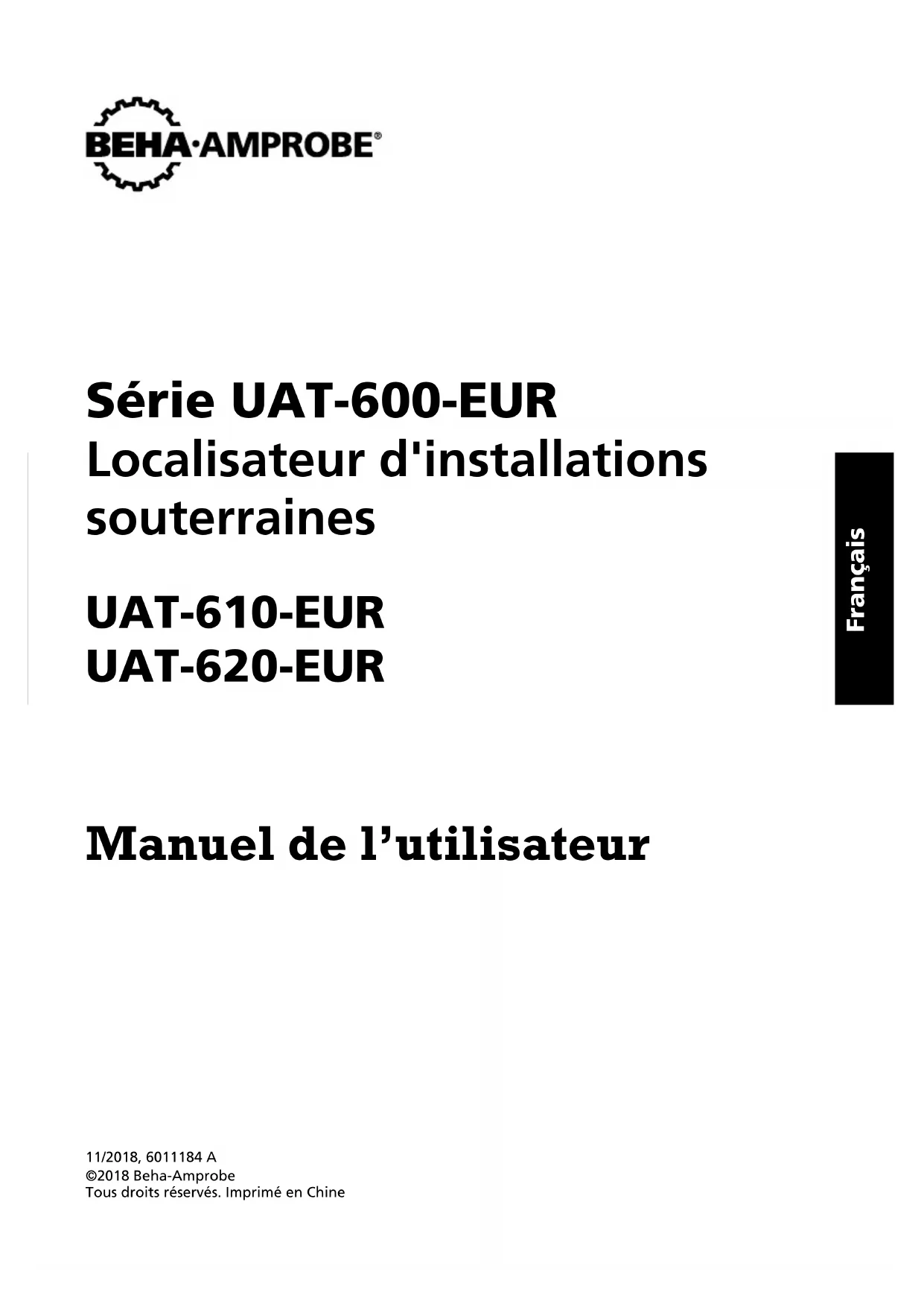 Compatibilità elettromagnetica IEC 61326-1 Corea (KCC): Apparecchiatura di Classe A (Apparecchiature Industriali di Trasmissione e Comunicazione) [1] [1] Questo prodotto soddisfa i requisiti per le apparecchiature elettromagnetiche industriali (Classe A) e il venditore o l'utente devono prenderne atto. Questa apparecchiatura è destinata ad essere utilizzata in ambienti aziendali e non deve essere utilizzata in ambienti domestici. Dimensioni (H x L x P) Circa 230 x 90 x 80 mm (9 x 3,5 x 3,1 pollici) Peso Circa 0,5 kg (1,1 libbre)Série UAT-600-EUR Localisateur d'installations souterraines UAT-610-EUR UAT-620-EUR Manuel de l’utilisateur 11/2018, 6011184 A ©2018 Beha-Amprobe Tous droits réservés. Imprimé en Chine FrançaisGarantie limitée et limitation de responsabilité Votre produit Beha-Amprobe sera exempt de défauts de matériaux et de fabrication pendant deux ans à compter de la date d'achat, sauf exigence contraire en vertu de la juridiction locale. Cette garantie ne s'applique pas aux fusibles, aux piles jetables ou endommagées par accident, à la négligence, à la mauvaise utilisation, à l'altération, à la contamination ou aux conditions anormales d'utilisation ou de manipulation. Les revendeurs ne sont pas autorisés à prolonger toute autre garantie au nom de Beha-Amprobe. Pour une réparation au cours de la période de garantie, retournez le produit avec la preuve d'achat à un centre de service autorisé par Beha-Amprobe ou à un revendeur ou un distributeur Beha-Amprobe. Voir la section Réparation pour plus de détails. CETTE GARANTIE EST VOTRE SEUL RECOURS. TOUTES LES AUTRES GARANTIES – QU'ELLES SOIENT EXPLICITES, IMPLICITES OU JURIDIQUES – Y COMPRIS LES GARANTIES IMPLICITES D'ADAPTATION À UN USAGE PARTICULIER OU MARCHAND, SONT EXCLUES. LE FABRICANT NE SERA PAS RESPONSABLE DES DOMMAGES SPECIAUX, INDIRECTS, ACCESSOIRES OU CONSECUTIFS PROVENANT DE TOUTE CAUSE OU THEORIE. Etant donné que certains pays ou états n'autorisent pas l'exclusion ou la limitation des garanties implicites ou des dommages directs ou indirects, cette limitation de responsabilité peut ne pas s'appliquer à vous. Réparation Tous les outils Beha-Amprobe retournés pour réparation sous garantie ou hors garantie ou pour étalonnage doivent être accompagnés de ce qui suit: votre nom, le nom de votre société, votre adresse, votre numéro de téléphone et la preuve d'achat. De plus, veuillez inclure une brève description du problème ou du service demandé et incluez les cordons de mesure avec le compteur. Les frais de réparation ou de remplacement non garantis doivent être réglés sous forme de chèque, mandat, carte de crédit avec date d'expiration ou bon de commande payable à Beha-Amprobe. Réparations et remplacement couverts par la garantie – Tous les pays Veuillez lire la déclaration de garantie et vérifier la pile avant de demander une réparation. Pendant la période de garantie, tout outil de vérification défectueux peut être retourné à votre distributeur Beha-Amprobe pour un échange de produit identique ou similaire. Veuillez consulter la section «Où acheter» sur le site beha- amprobe.com pour obtenir une liste des distributeurs près de chez vous. En outre, aux États-Unis et au Canada, les réparations sous garantie et les unités de remplacement peuvent également être envoyés à un centre de service Amprobe (voir adresse ci-dessous). Réparation et remplacement non couverts par la garantie – Europe Les unités hors garantie européenne peuvent être remplacées par votre distributeur Amprobe/Beha-Amprobe pour une somme modique. Veuillez consulter la section «Où acheter» sur le site beha-amprobe.com pour obtenir une liste des distributeurs près de chez vous. Beha-Amprobe Division et marque déposée de Fluke Corp. (USA) Allemagne* Royaume-Uni Pays-Bas - Siège social** In den Engematten 14 52 Hurricane Way Science Park Eindhoven 5110 79286 Glottertal Norwich, Norfolk 5692 EC Son Allemagne NR6 6JB Royaume-Uni Pays-Bas Téléphone : +49 (0) 7684 8009 - 0 Téléphone: +44 (0) 1603 25 6662 Téléphone: +31 (0) 40 267 51 00 beha-amprobe.de beha-amprobe.com beha-amprobe.com *(Correspondance uniquement: aucune réparation ou remplacement à cette adresse. Clients européens, veuil- lez contacter votre distributeur.) **adresse de contact unique dans l'EEE Fluke Europe BV1 Localisateur d'installations souterraines série UAT-600-EUR