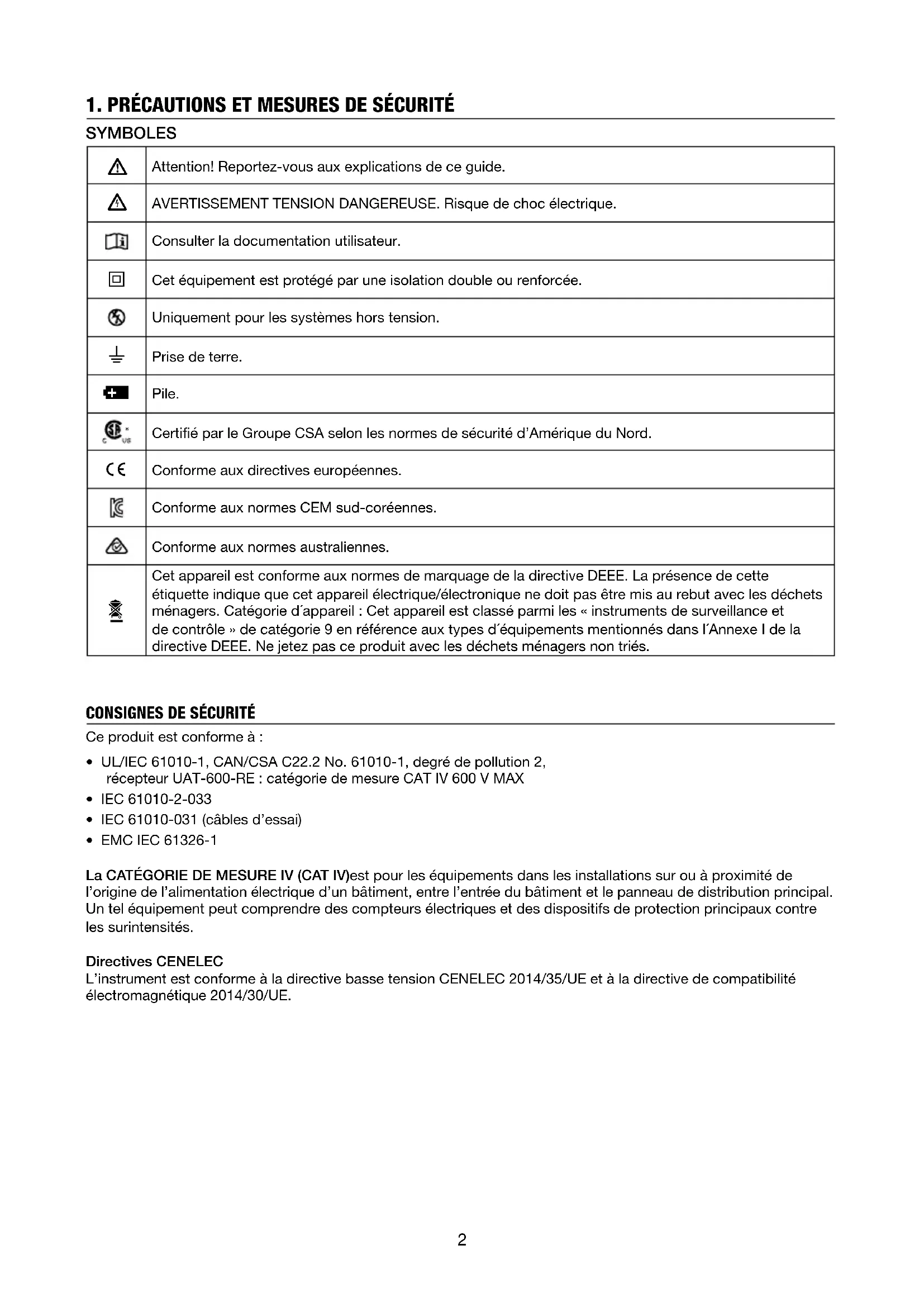 - EMC IEC 61326-1 La CATÉGORIE DE MESURE IV (CAT IV)est pour les équipements dans les installations sur ou à proximité de l’origine de l’alimentation électrique d’un bâtiment, entre l’entrée du bâtiment et le panneau de distribution principal. Un tel équipement peut comprendre des compteurs électriques et des dispositifs de protection principaux contre les surintensités. Directives CENELEC L’instrument est conforme à la directive basse tension CENELEC 2014/35/UE et à la directive de compatibilité électromagnétique 2014/30/UE.3 Avertissements : Lire avant utilisation Pour éviter la possibilité d’une électrocution ou d’une blessure: