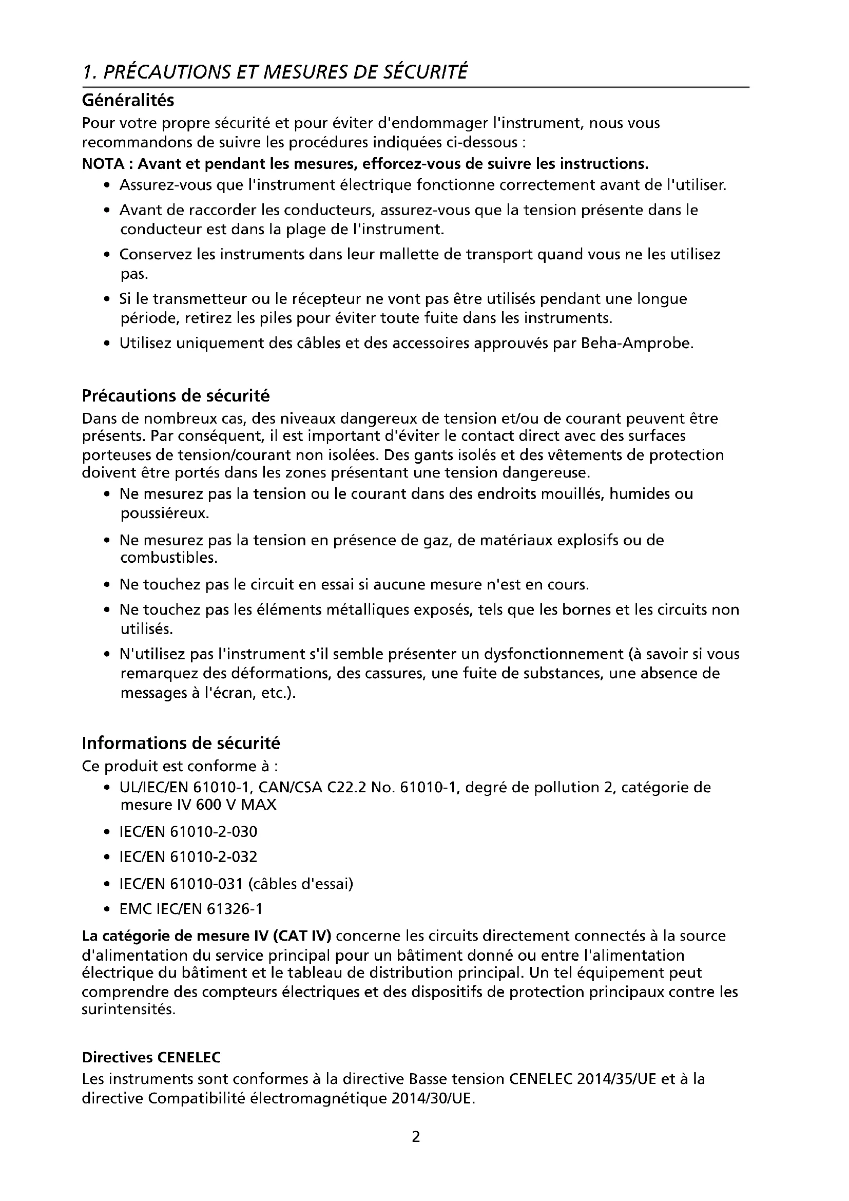 - EMC IEC/EN 61326-1 La catégorie de mesure IV (CAT IV) concerne les circuits directement connectés à la source d'alimentation du service principal pour un bâtiment donné ou entre l'alimentation électrique du bâtiment et le tableau de distribution principal. Un tel équipement peut comprendre des compteurs électriques et des dispositifs de protection principaux contre les surintensités. Directives CENELEC Les instruments sont conformes à la directive Basse tension CENELEC 2014/35/UE et à la directive Compatibilité électromagnétique 2014/30/UE.3 Avertissements : Lire avant utilisation Pour éviter la possibilité d'une électrocution ou d'une blessure: