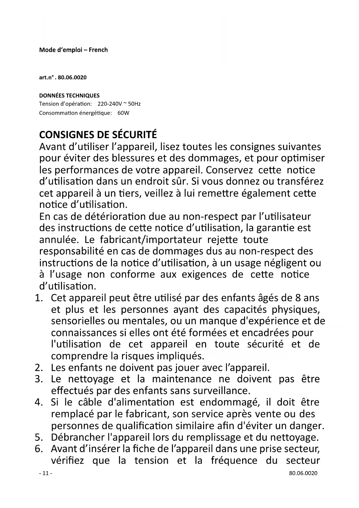 Avant d’utiliser l’appareil, lisez toutes les consignes suivantes pour éviter des blessures et des dommages, et pour optimiser les performances de votre appareil. Conservez cette notice d’utilisation dans un endroit sûr. Si vous donnez ou transférez cet appareil à un tiers, veillez à lui remettre également cette notice d’utilisation. En cas de détérioration due au non-respect par l’utilisateur des instructions de cette notice d’utilisation, la garantie est annulée. Le fabricant/importateur rejette toute responsabilité en cas de dommages dus au non-respect des instructions de la notice d’utilisation, à un usage négligent ou à l’usage non conforme aux exigences de cette notice d’utilisation.
