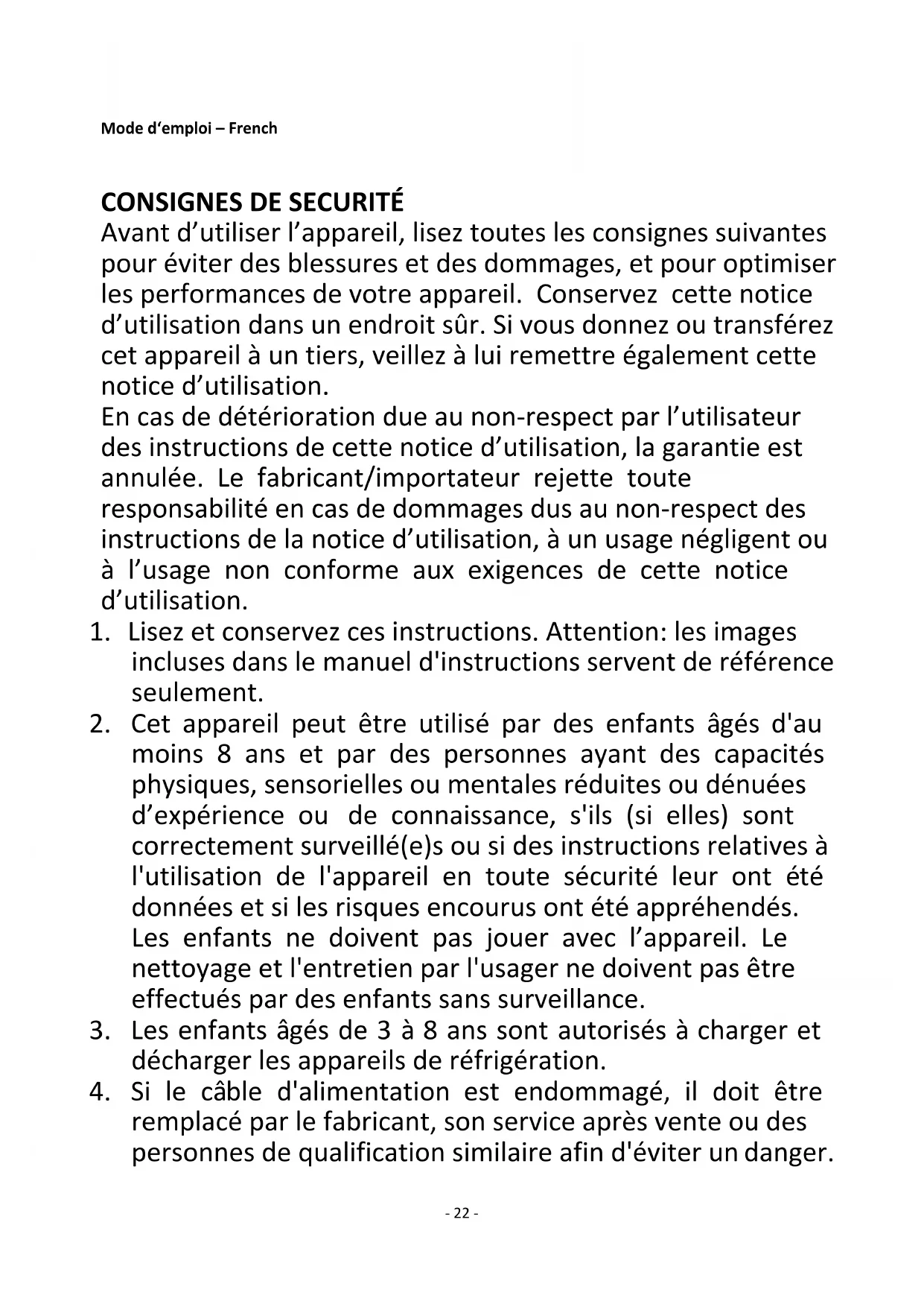 Avant d’utiliser l’appareil, lisez toutes les consignes suivantes pour éviter des blessures et des dommages, et pour optimiser les performances de votre appareil. Conservez cette notice d’utilisation dans un endroit sûr. Si vous donnez ou transférez cet appareil à un tiers, veillez à lui remettre également cette notice d’utilisation. En cas de détérioration due au non-respect par l’utilisateur des instructions de cette notice d’utilisation, la garantie est annulée. Le fabricant/importateur rejette toute responsabilité en cas de dommages dus au non-respect des instructions de la notice d’utilisation, à un usage négligent ou à l’usage non conforme aux exigences de cette notice d’utilisation.