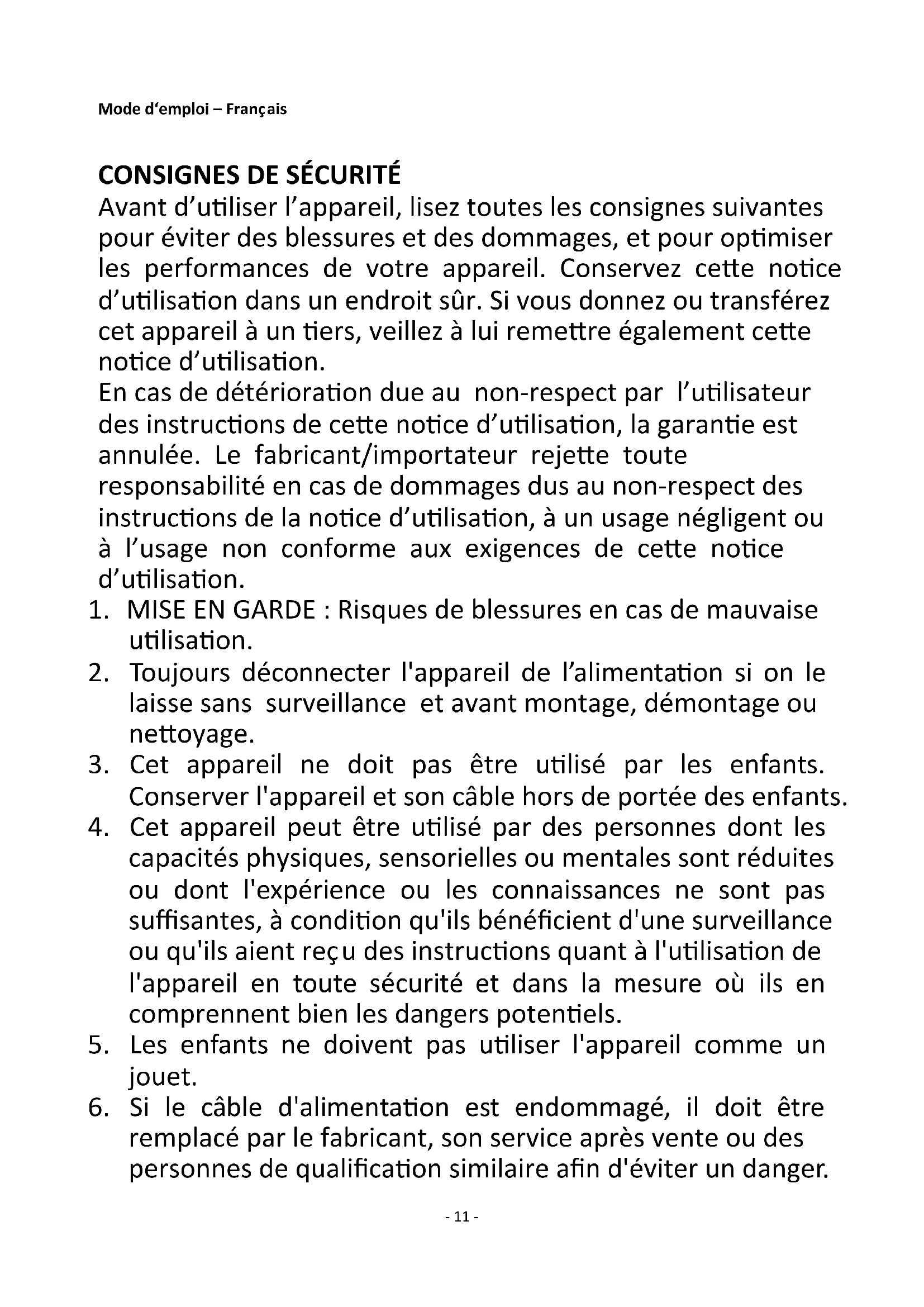 Avant d’utiliser l’appareil, lisez toutes les consignes suivantes pour éviter des blessures et des dommages, et pour optimiser les performances de votre appareil. Conservez cette notice d’utilisation dans un endroit sûr. Si vous donnez ou transférez cet appareil à un tiers, veillez à lui remettre également cette notice d’utilisation. En cas de détérioration due au non-respect par l’utilisateur des instructions de cette notice d’utilisation, la garantie est annulée. Le fabricant/importateur rejette toute responsabilité en cas de dommages dus au non-respect des instructions de la notice d’utilisation, à un usage négligent ou à l’usage non conforme aux exigences de cette notice d’utilisation.