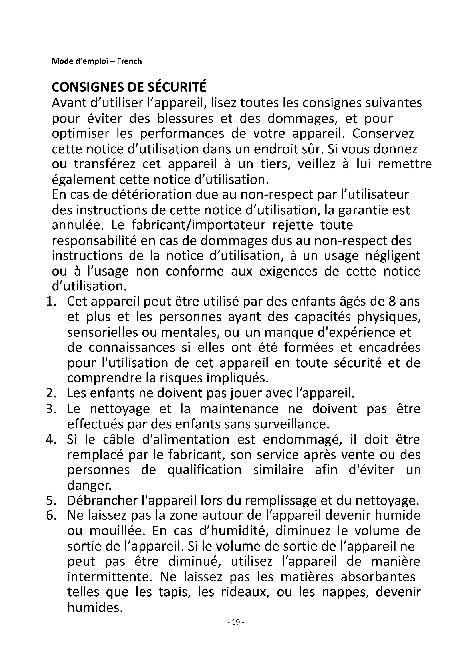 Avant d’utiliser l’appareil, lisez toutes les consignes suivantes pour éviter des blessures et des dommages, et pour optimiser les performances de votre appareil. Conservez cette notice d’utilisation dans un endroit sûr. Si vous donnez ou transférez cet appareil à un tiers, veillez à lui remettre également cette notice d’utilisation. En cas de détérioration due au non-respect par l’utilisateur des instructions de cette notice d’utilisation, la garantie est annulée. Le fabricant/importateur rejette toute responsabilité en cas de dommages dus au non-respect des instructions de la notice d’utilisation, à un usage négligent ou à l’usage non conforme aux exigences de cette notice d’utilisation.