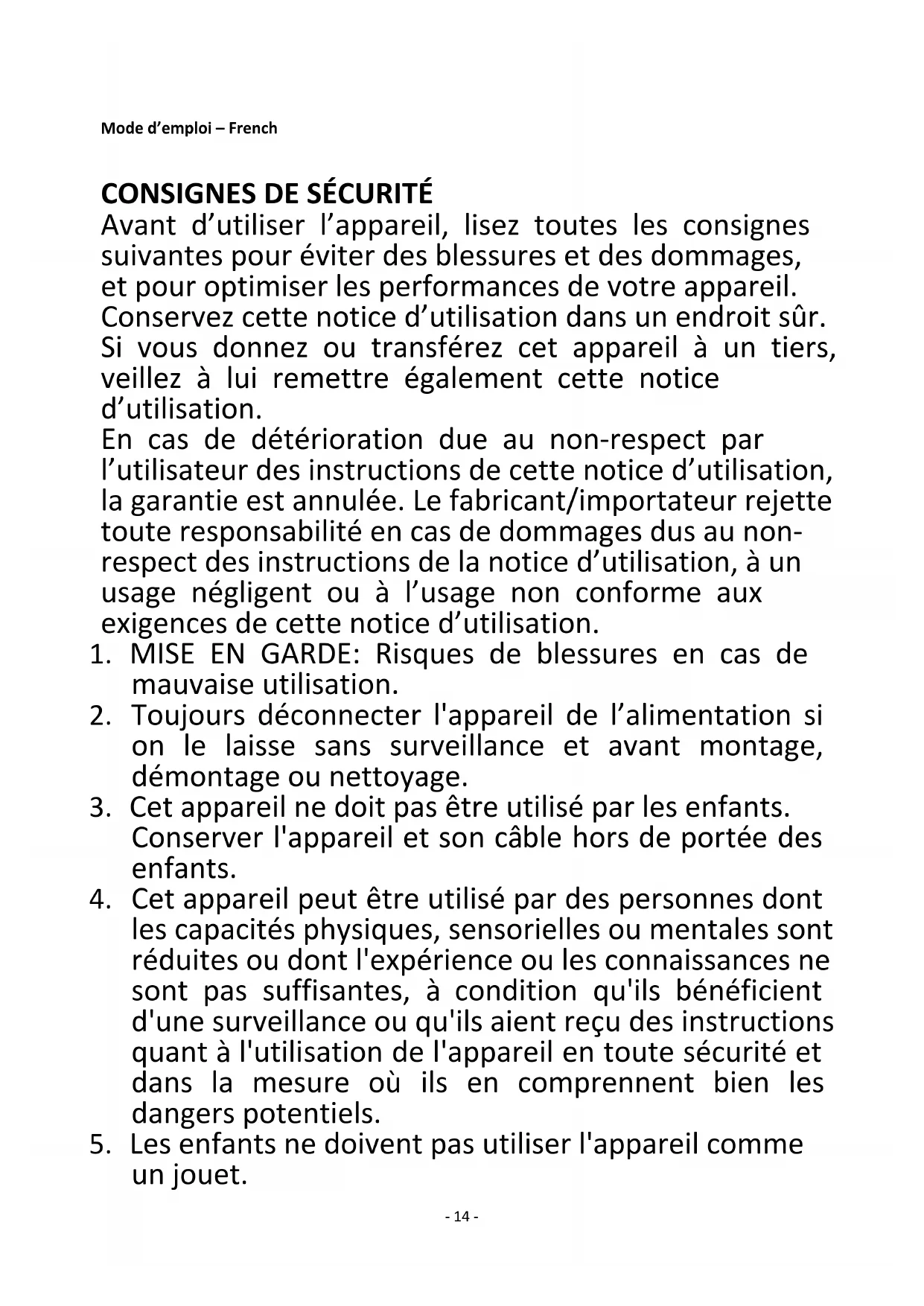 Avant d’utiliser l’appareil, lisez toutes les consignes suivantes pour éviter des blessures et des dommages, et pour optimiser les performances de votre appareil. Conservez cette notice d’utilisation dans un endroit sûr. Si vous donnez ou transférez cet appareil à un tiers, veillez à lui remettre également cette notice d’utilisation. En cas de détérioration due au non-respect par l’utilisateur des instructions de cette notice d’utilisation, la garantie est annulée. Le fabricant/importateur rejette toute responsabilité en cas de dommages dus au non- respect des instructions de la notice d’utilisation, à un usage négligent ou à l’usage non conforme aux exigences de cette notice d’utilisation.