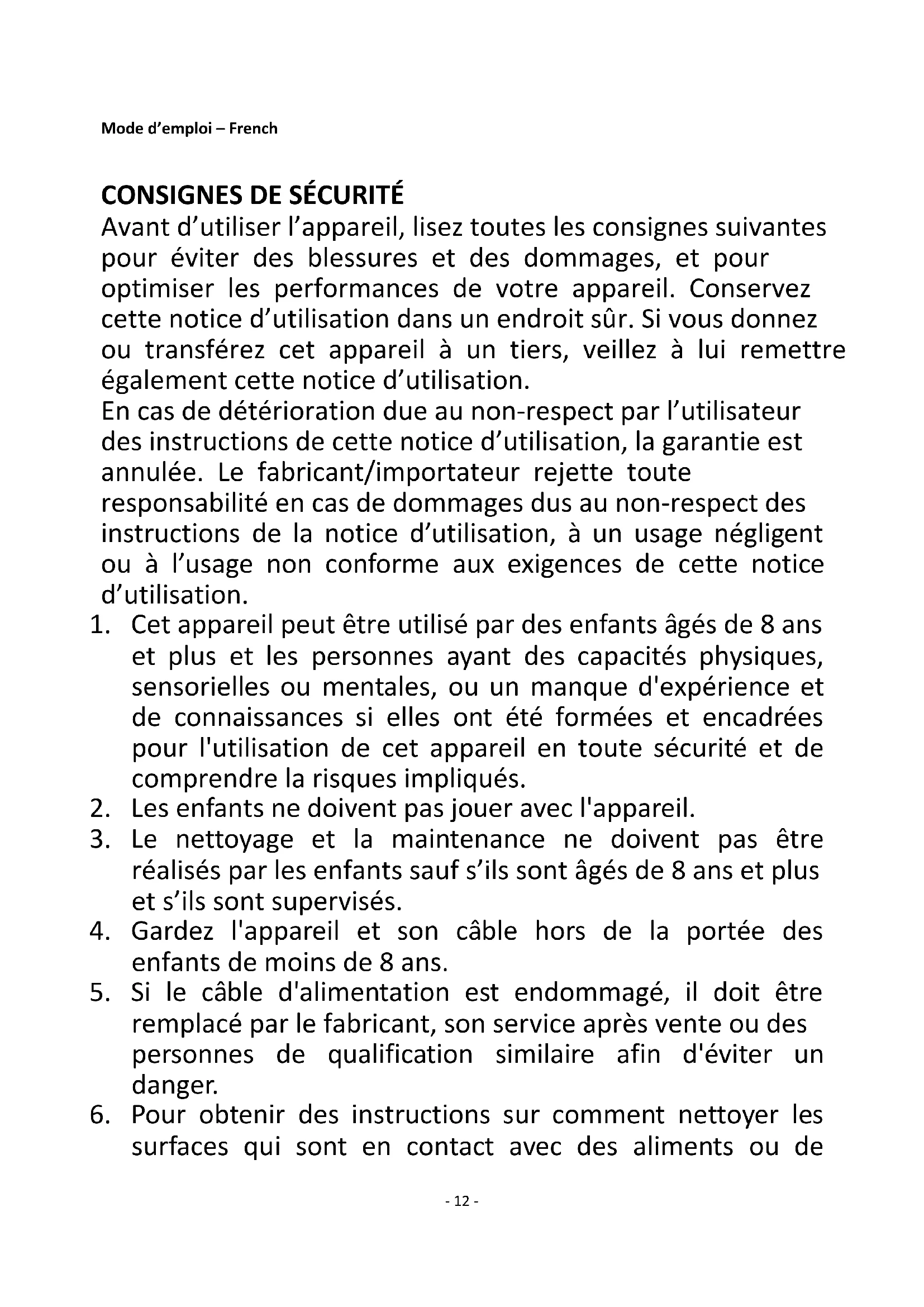 Avant d’utiliser l’appareil, lisez toutes les consignes suivantes pour éviter des blessures et des dommages, et pour optimiser les performances de votre appareil. Conservez cette notice d’utilisation dans un endroit sûr. Si vous donnez ou transférez cet appareil à un tiers, veillez à lui remettre également cette notice d’utilisation. En cas de détérioration due au non-respect par l’utilisateur des instructions de cette notice d’utilisation, la garantie est annulée. Le fabricant/importateur rejette toute responsabilité en cas de dommages dus au non-respect des instructions de la notice d’utilisation, à un usage négligent ou à l’usage non conforme aux exigences de cette notice d’utilisation.