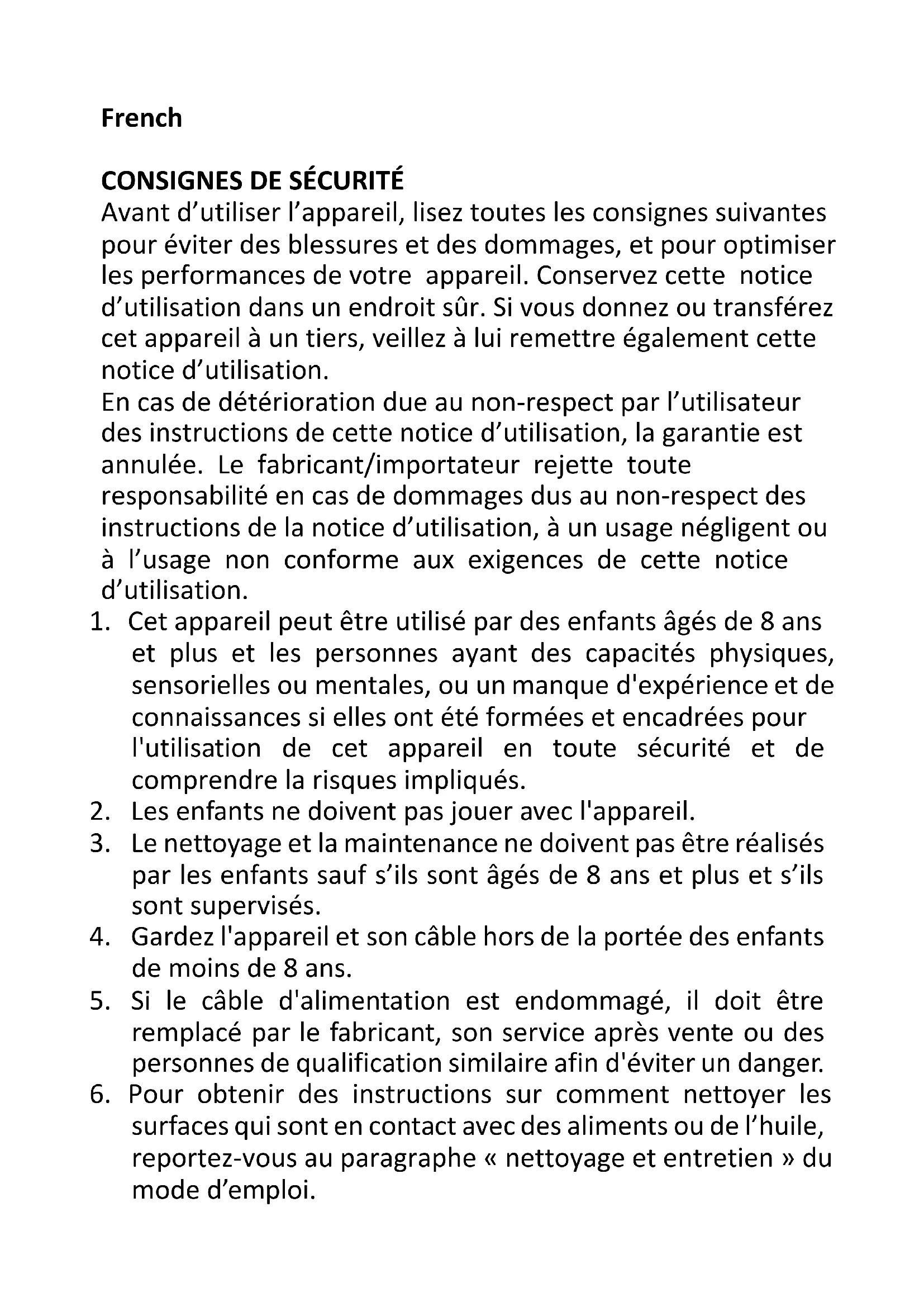 Avant d’utiliser l’appareil, lisez toutes les consignes suivantes pour éviter des blessures et des dommages, et pour optimiser les performances de votre appareil. Conservez cette notice d’utilisation dans un endroit sûr. Si vous donnez ou transférez cet appareil à un tiers, veillez à lui remettre également cette notice d’utilisation. En cas de détérioration due au non-respect par l’utilisateur des instructions de cette notice d’utilisation, la garantie est annulée. Le fabricant/importateur rejette toute responsabilité en cas de dommages dus au non-respect des instructions de la notice d’utilisation, à un usage négligent ou à l’usage non conforme aux exigences de cette notice d’utilisation.