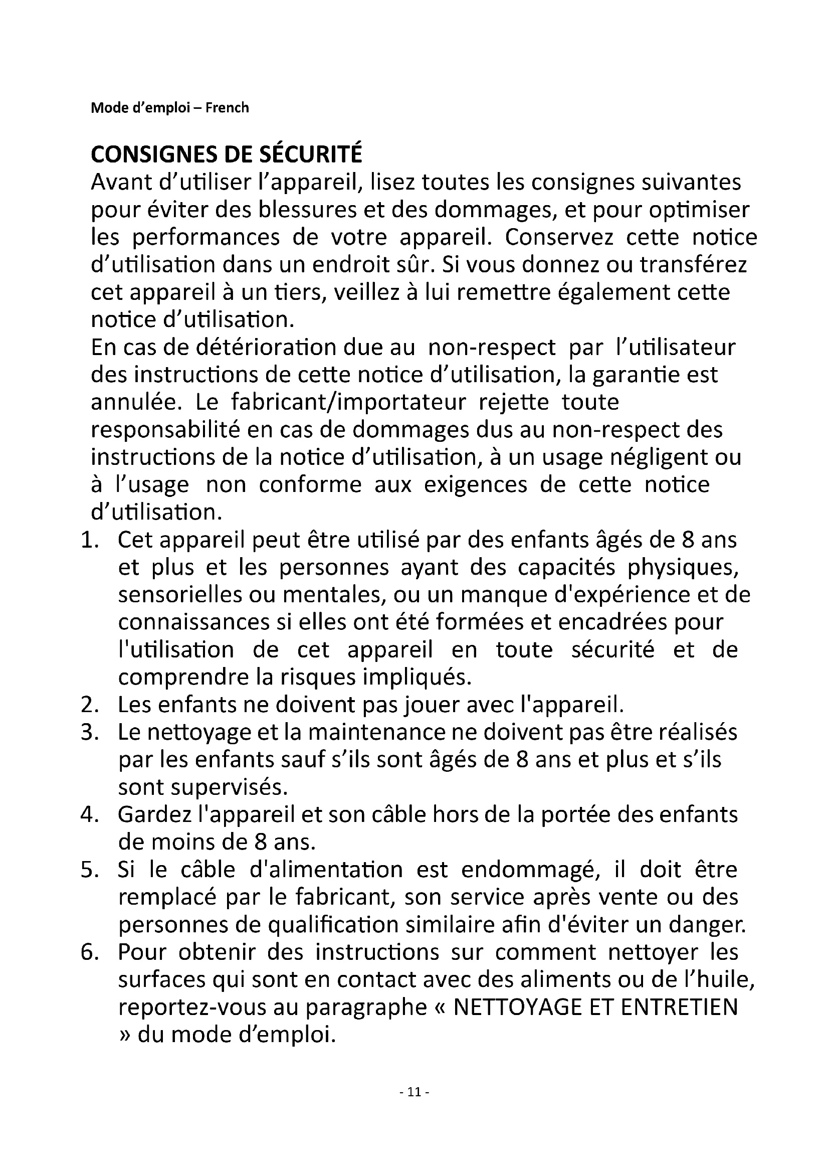 Avant d’utiliser l’appareil, lisez toutes les consignes suivantes pour éviter des blessures et des dommages, et pour optimiser les performances de votre appareil. Conservez cette notice d’utilisation dans un endroit sûr. Si vous donnez ou transférez cet appareil à un tiers, veillez à lui remettre également cette notice d’utilisation. En cas de détérioration due au non-respect par l’utilisateur des instructions de cette notice d’utilisation, la garantie est annulée. Le fabricant/importateur rejette toute responsabilité en cas de dommages dus au non-respect des instructions de la notice d’utilisation, à un usage négligent ou à l’usage non conforme aux exigences de cette notice d’utilisation.