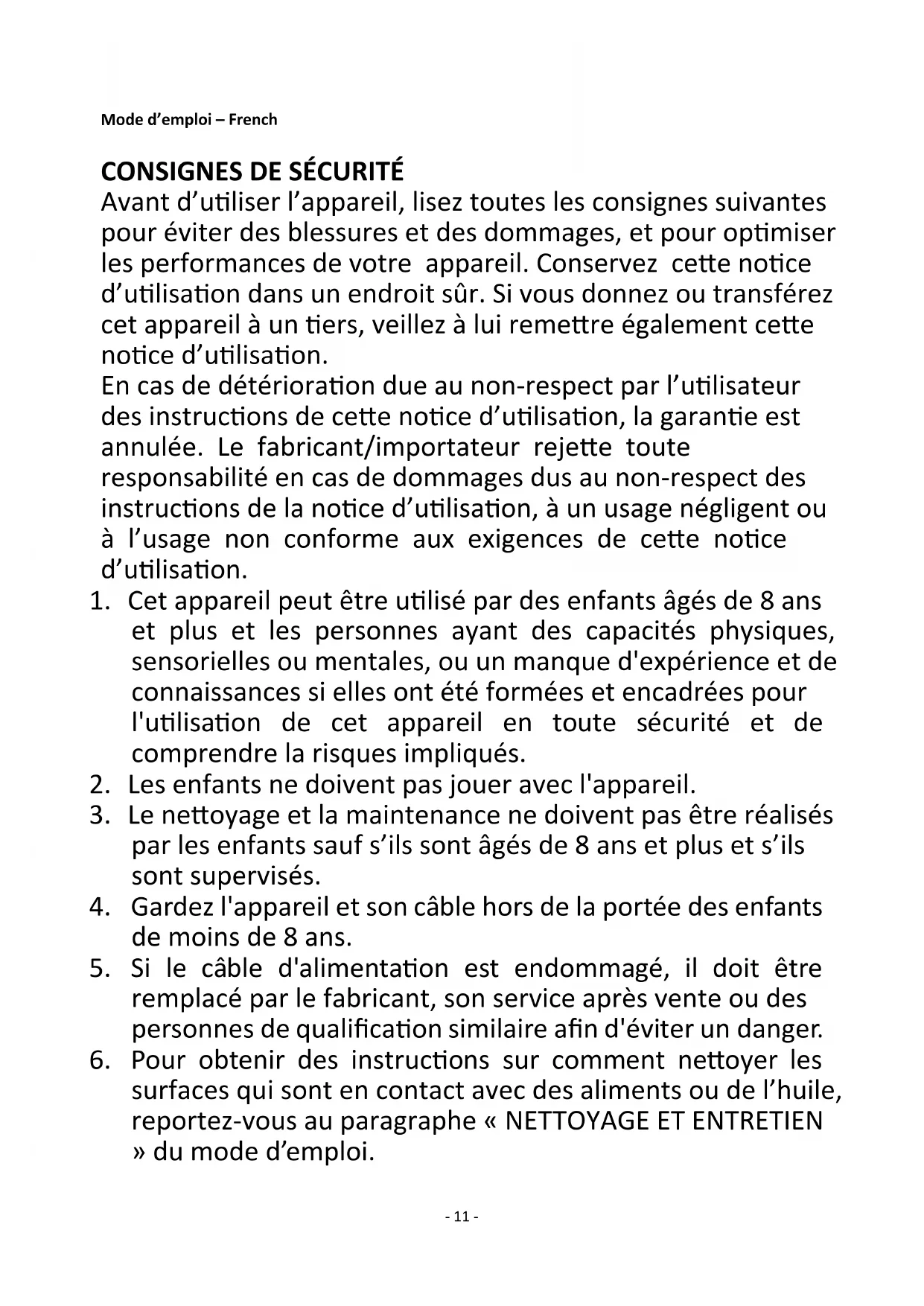 Avant d’utiliser l’appareil, lisez toutes les consignes suivantes pour éviter des blessures et des dommages, et pour optimiser les performances de votre appareil. Conservez cette notice d’utilisation dans un endroit sûr. Si vous donnez ou transférez cet appareil à un tiers, veillez à lui remettre également cette notice d’utilisation. En cas de détérioration due au non-respect par l’utilisateur des instructions de cette notice d’utilisation, la garantie est annulée. Le fabricant/importateur rejette toute responsabilité en cas de dommages dus au non-respect des instructions de la notice d’utilisation, à un usage négligent ou à l’usage non conforme aux exigences de cette notice d’utilisation.