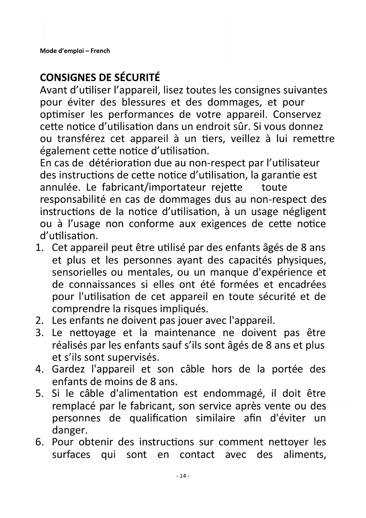 Avant d’utiliser l’appareil, lisez toutes les consignes suivantes pour éviter des blessures et des dommages, et pour optimiser les performances de votre appareil. Conservez cette notice d’utilisation dans un endroit sûr. Si vous donnez ou transférez cet appareil à un tiers, veillez à lui remettre également cette notice d’utilisation. En cas de détérioration due au non-respect par l’utilisateur des instructions de cette notice d’utilisation, la garantie est annulée. Le fabricant/importateur rejette toute responsabilité en cas de dommages dus au non-respect des instructions de la notice d’utilisation, à un usage négligent ou à l’usage non conforme aux exigences de cette notice d’utilisation.