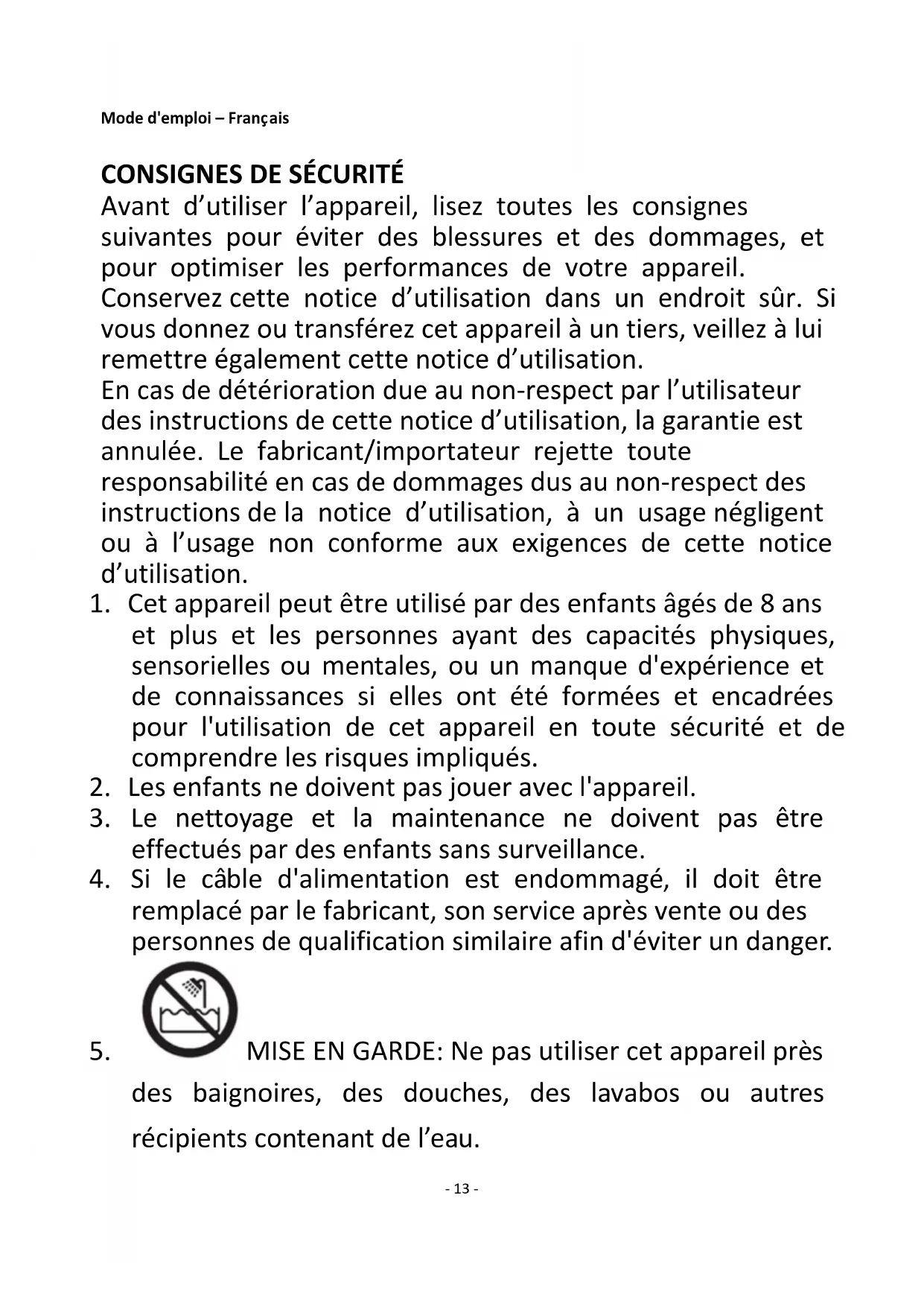 13. Ne touchez pas l’appareil s’il tombe dans de l’eau.