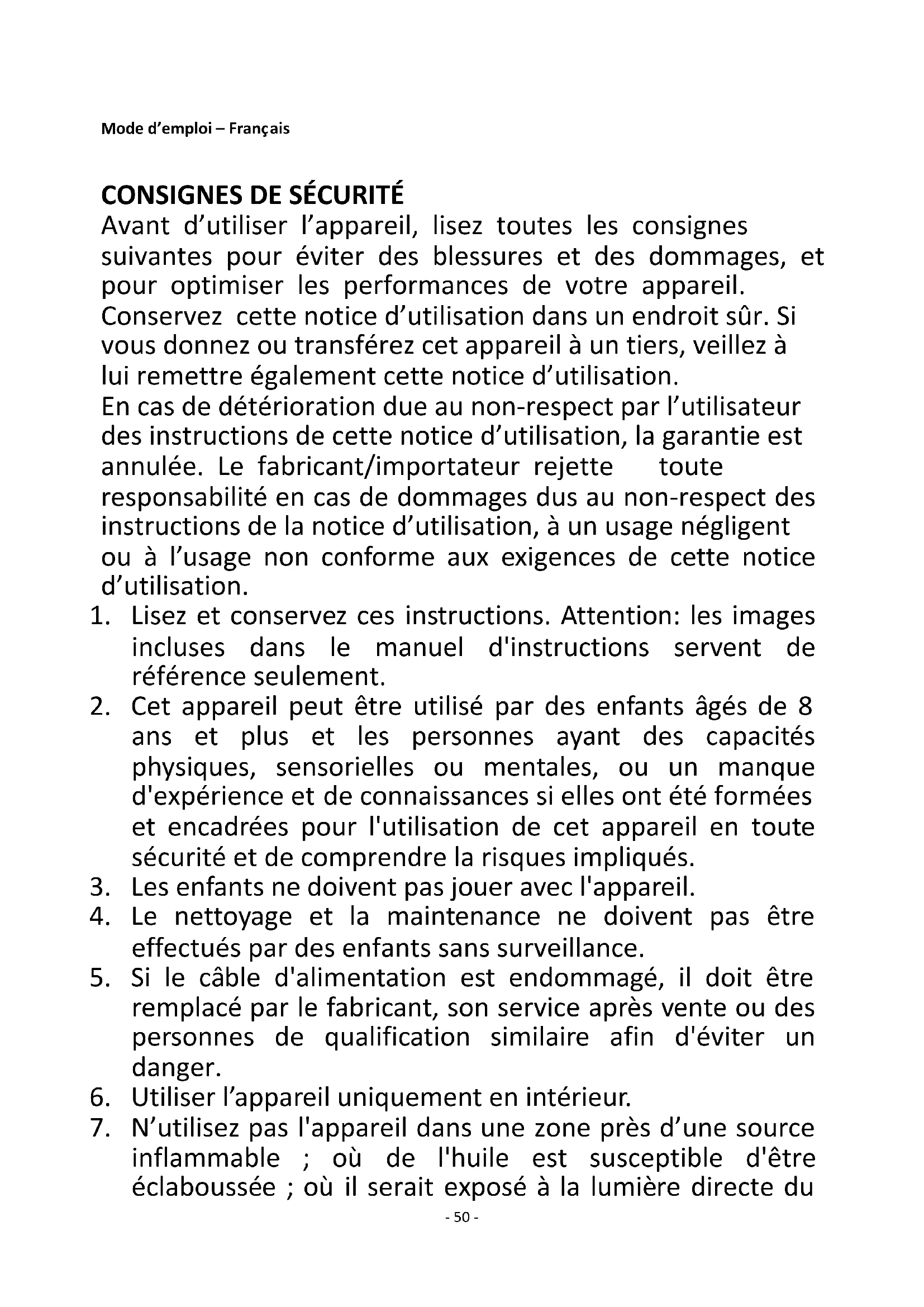 Avant d’utiliser l’appareil, lisez toutes les consignes suivantes pour éviter des blessures et des dommages, et pour optimiser les performances de votre appareil. Conservez cette notice d’utilisation dans un endroit sûr. Si vous donnez ou transférez cet appareil à un tiers, veillez à lui remettre également cette notice d’utilisation. En cas de détérioration due au non-respect par l’utilisateur des instructions de cette notice d’utilisation, la garantie est annulée. Le fabricant/importateur rejette toute responsabilité en cas de dommages dus au non-respect des instructions de la notice d’utilisation, à un usage négligent ou à l’usage non conforme aux exigences de cette notice d’utilisation.
