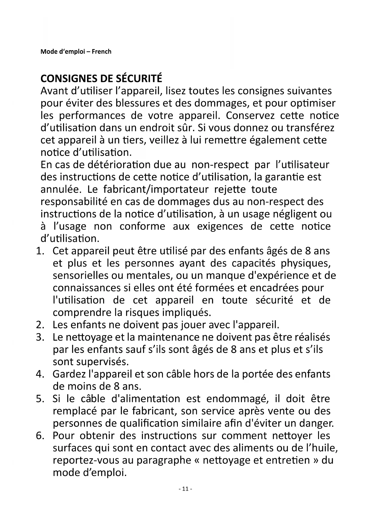 Avant d’utiliser l’appareil, lisez toutes les consignes suivantes pour éviter des blessures et des dommages, et pour optimiser les performances de votre appareil. Conservez cette notice d’utilisation dans un endroit sûr. Si vous donnez ou transférez cet appareil à un tiers, veillez à lui remettre également cette notice d’utilisation. En cas de détérioration due au non-respect par l’utilisateur des instructions de cette notice d’utilisation, la garantie est annulée. Le fabricant/importateur rejette toute responsabilité en cas de dommages dus au non-respect des instructions de la notice d’utilisation, à un usage négligent ou à l’usage non conforme aux exigences de cette notice d’utilisation.