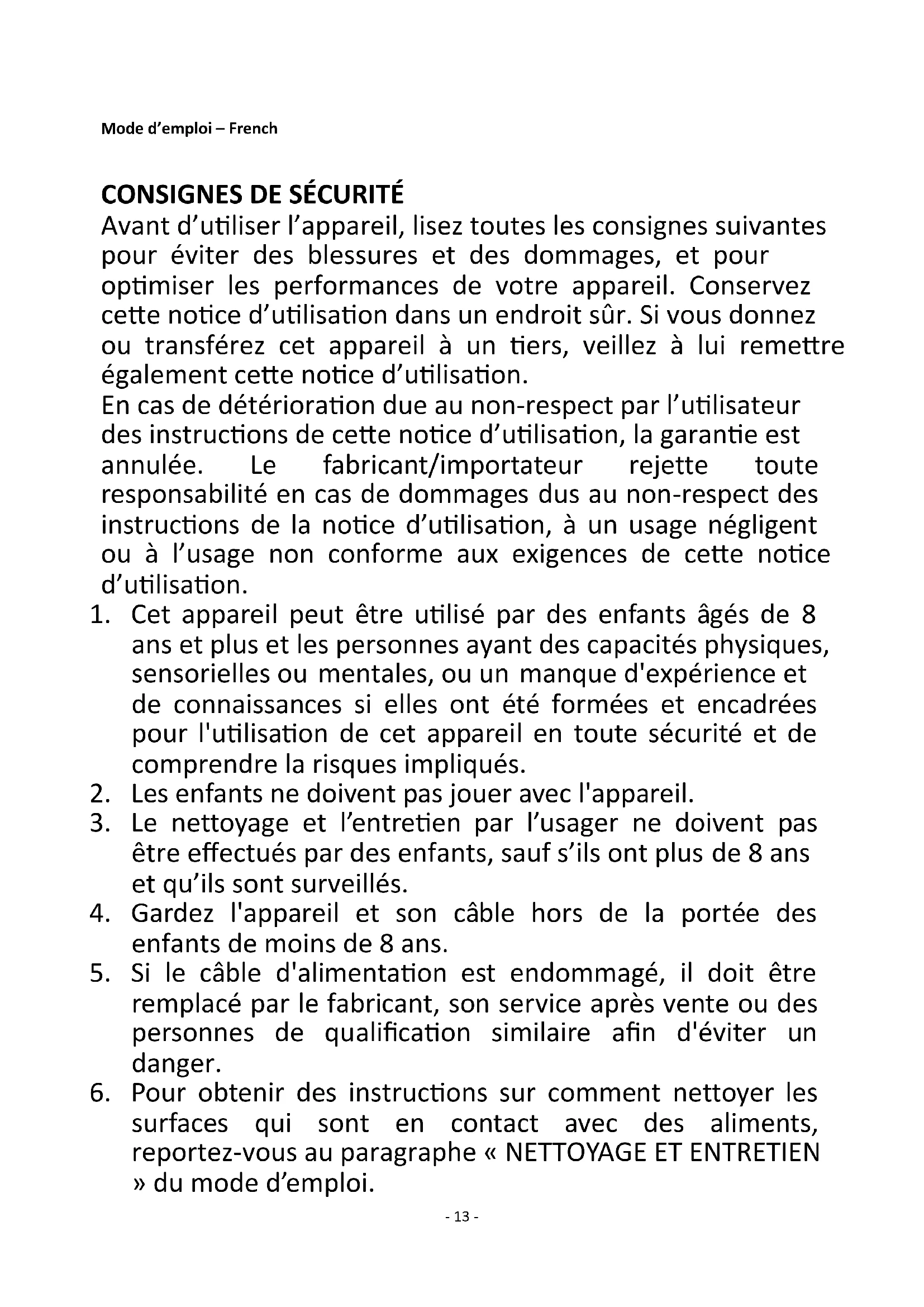 Avant d’utiliser l’appareil, lisez toutes les consignes suivantes pour éviter des blessures et des dommages, et pour optimiser les performances de votre appareil. Conservez cette notice d’utilisation dans un endroit sûr. Si vous donnez ou transférez cet appareil à un tiers, veillez à lui remettre également cette notice d’utilisation. En cas de détérioration due au non-respect par l’utilisateur des instructions de cette notice d’utilisation, la garantie est annulée. Le fabricant/importateur rejette toute responsabilité en cas de dommages dus au non-respect des instructions de la notice d’utilisation, à un usage négligent ou à l’usage non conforme aux exigences de cette notice d’utilisation.