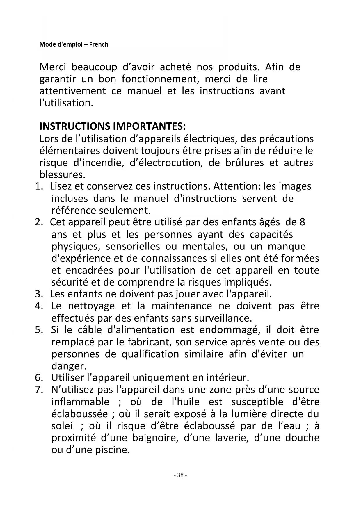 - Lisez et conservez ces instructions. ATTENTION: les images inclues dans le manuel d'instructions servent de référence seulement.