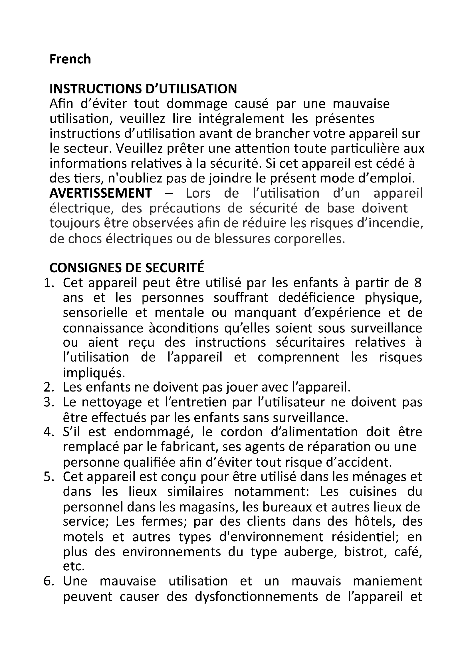 Afin d’éviter tout dommage causé par une mauvaise utilisation, veuillez lire intégralement les présentes instructions d’utilisation avant de brancher votre appareil sur le secteur. Veuillez prêter une attention toute particulière aux informations relatives à la sécurité. Si cet appareil est cédé à des tiers, n'oubliez pas de joindre le présent mode d’emploi. AVERTISSEMENT – Lors de l’utilisation d’un appareil électrique, des précautions de sécurité de base doivent toujours être observées afin de réduire les risques d’incendie, de chocs électriques ou de blessures corporelles.