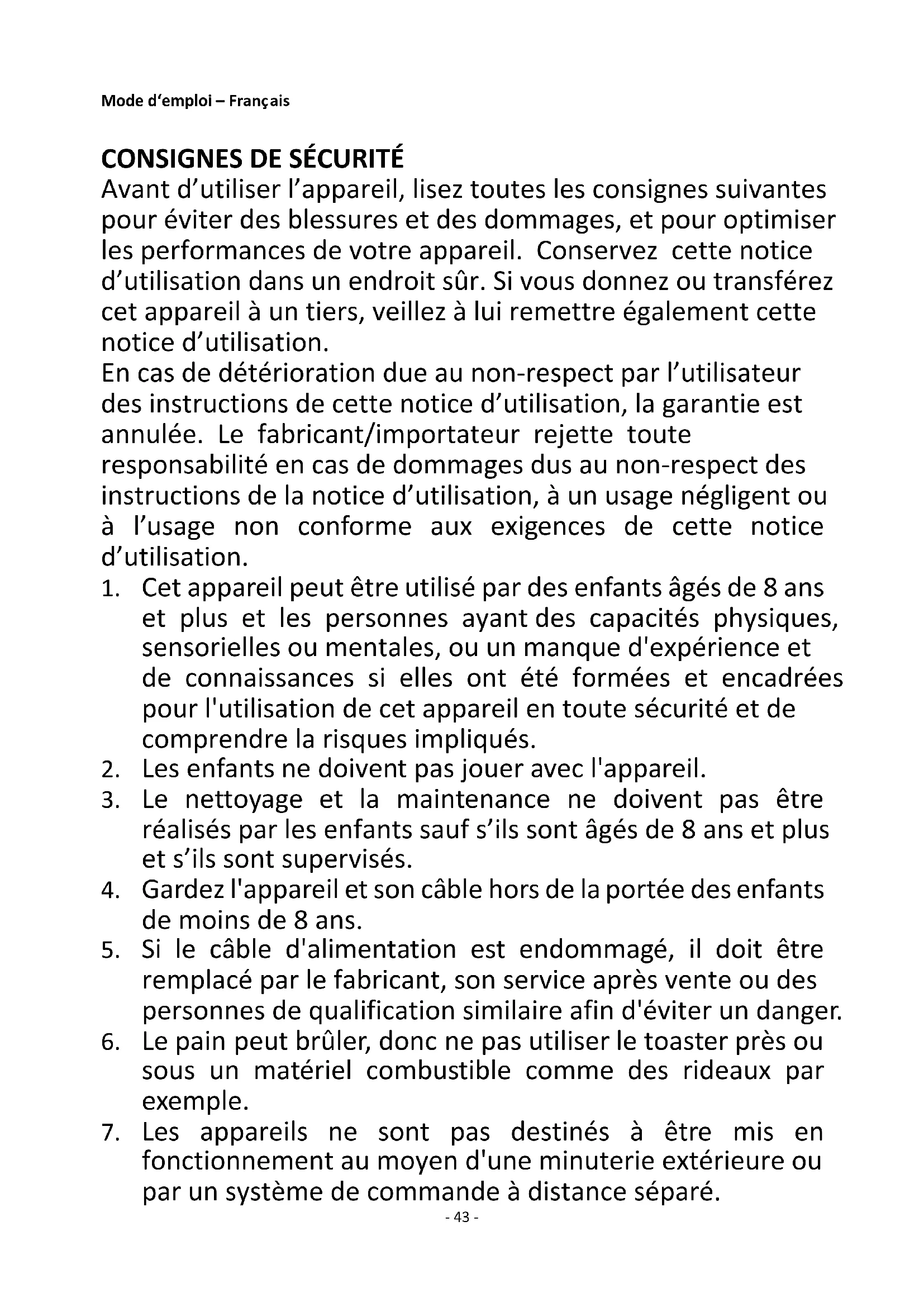 les miettes collées à l'intérieur tombent. Nettoyez régulièrement le plateau ramasse-miettes pour éviter que les miettes s'accumulent à l'intérieur. CARACTERISTIQUES TECHNIQUES Tension de service: 220-240V~ 50-60Hz Puissance: 680-800W