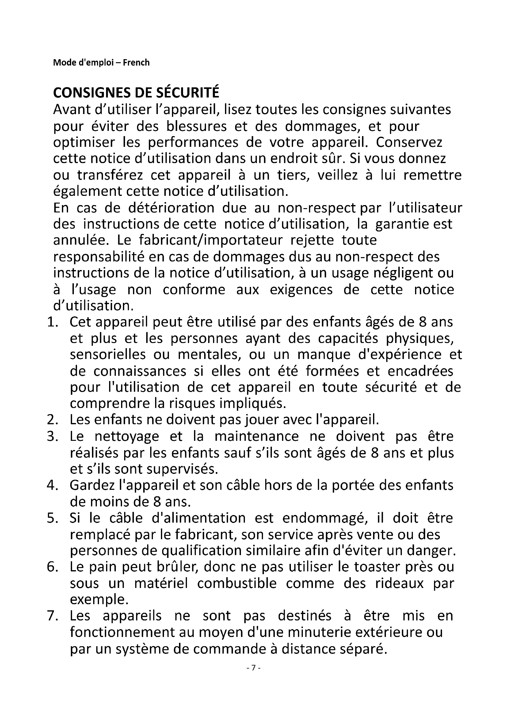 Avant d’utiliser l’appareil, lisez toutes les consignes suivantes pour éviter des blessures et des dommages, et pour optimiser les performances de votre appareil. Conservez cette notice d’utilisation dans un endroit sûr. Si vous donnez ou transférez cet appareil à un tiers, veillez à lui remettre également cette notice d’utilisation. En cas de détérioration due au non-respect par l’utilisateur des instructions de cette notice d’utilisation, la garantie est annulée. Le fabricant/importateur rejette toute responsabilité en cas de dommages dus au non-respect des instructions de la notice d’utilisation, à un usage négligent ou à l’usage non conforme aux exigences de cette notice d’utilisation.