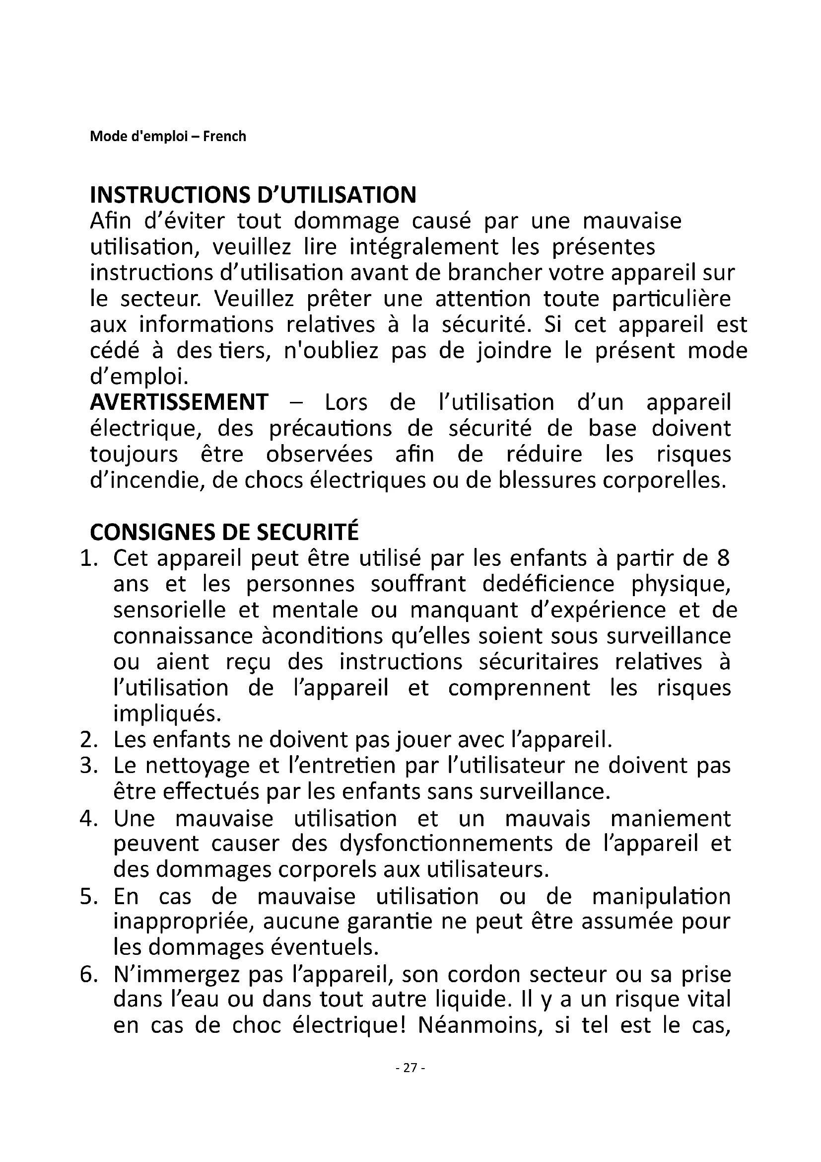 Afin d’éviter tout dommage causé par une mauvaise utilisation, veuillez lire intégralement les présentes instructions d’utilisation avant de brancher votre appareil sur le secteur. Veuillez prêter une attention toute particulière aux informations relatives à la sécurité. Si cet appareil est cédé à des tiers, n'oubliez pas de joindre le présent mode d’emploi. AVERTISSEMENT – Lors de l’utilisation d’un appareil électrique, des précautions de sécurité de base doivent toujours être observées afin de réduire les risques d’incendie, de chocs électriques ou de blessures corporelles.