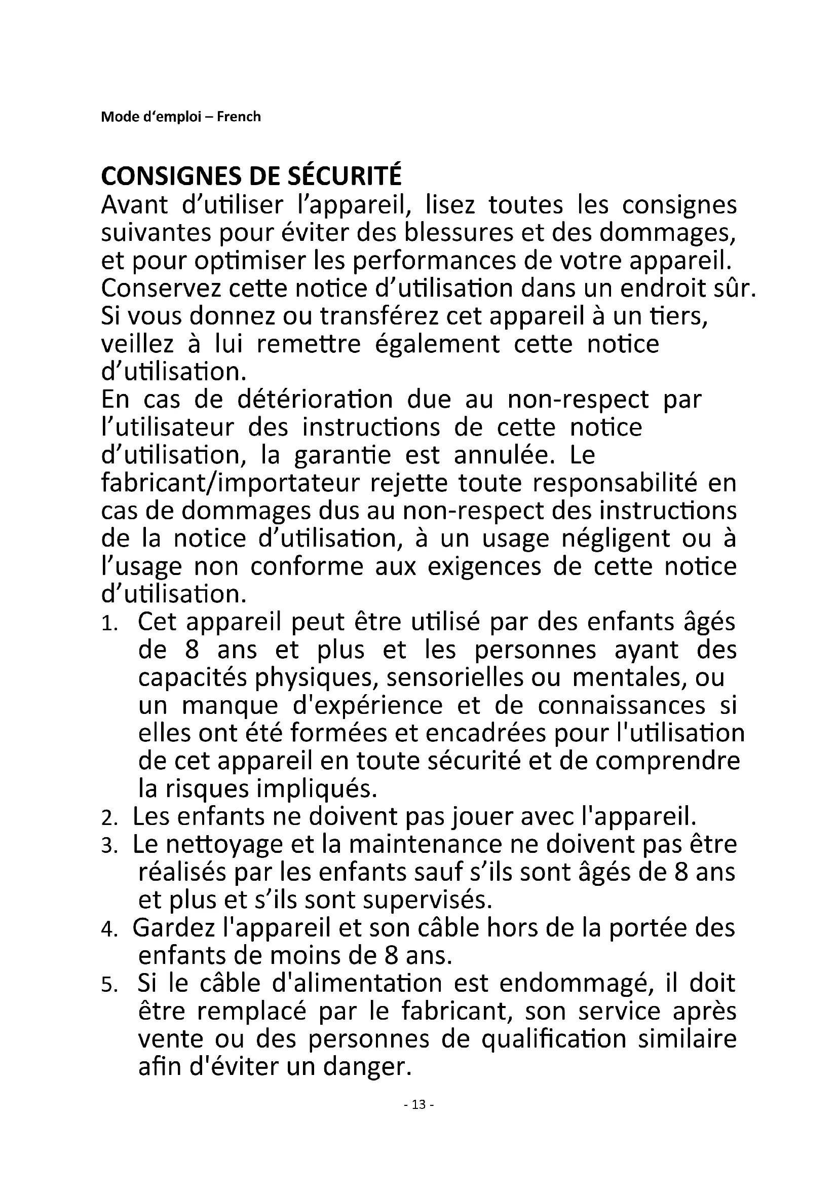 Avant d’utiliser l’appareil, lisez toutes les consignes suivantes pour éviter des blessures et des dommages, et pour optimiser les performances de votre appareil. Conservez cette notice d’utilisation dans un endroit sûr. Si vous donnez ou transférez cet appareil à un tiers, veillez à lui remettre également cette notice d’utilisation. En cas de détérioration due au non-respect par l’utilisateur des instructions de cette notice d’utilisation, la garantie est annulée. Le fabricant/importateur rejette toute responsabilité en cas de dommages dus au non-respect des instructions de la notice d’utilisation, à un usage négligent ou à l’usage non conforme aux exigences de cette notice d’utilisation.