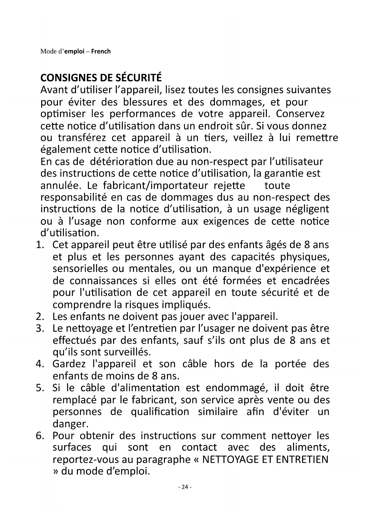 Avant d’utiliser l’appareil, lisez toutes les consignes suivantes pour éviter des blessures et des dommages, et pour optimiser les performances de votre appareil. Conservez cette notice d’utilisation dans un endroit sûr. Si vous donnez ou transférez cet appareil à un tiers, veillez à lui remettre également cette notice d’utilisation. En cas de détérioration due au non-respect par l’utilisateur des instructions de cette notice d’utilisation, la garantie est annulée. Le fabricant/importateur rejette toute responsabilité en cas de dommages dus au non-respect des instructions de la notice d’utilisation, à un usage négligent ou à l’usage non conforme aux exigences de cette notice d’utilisation.