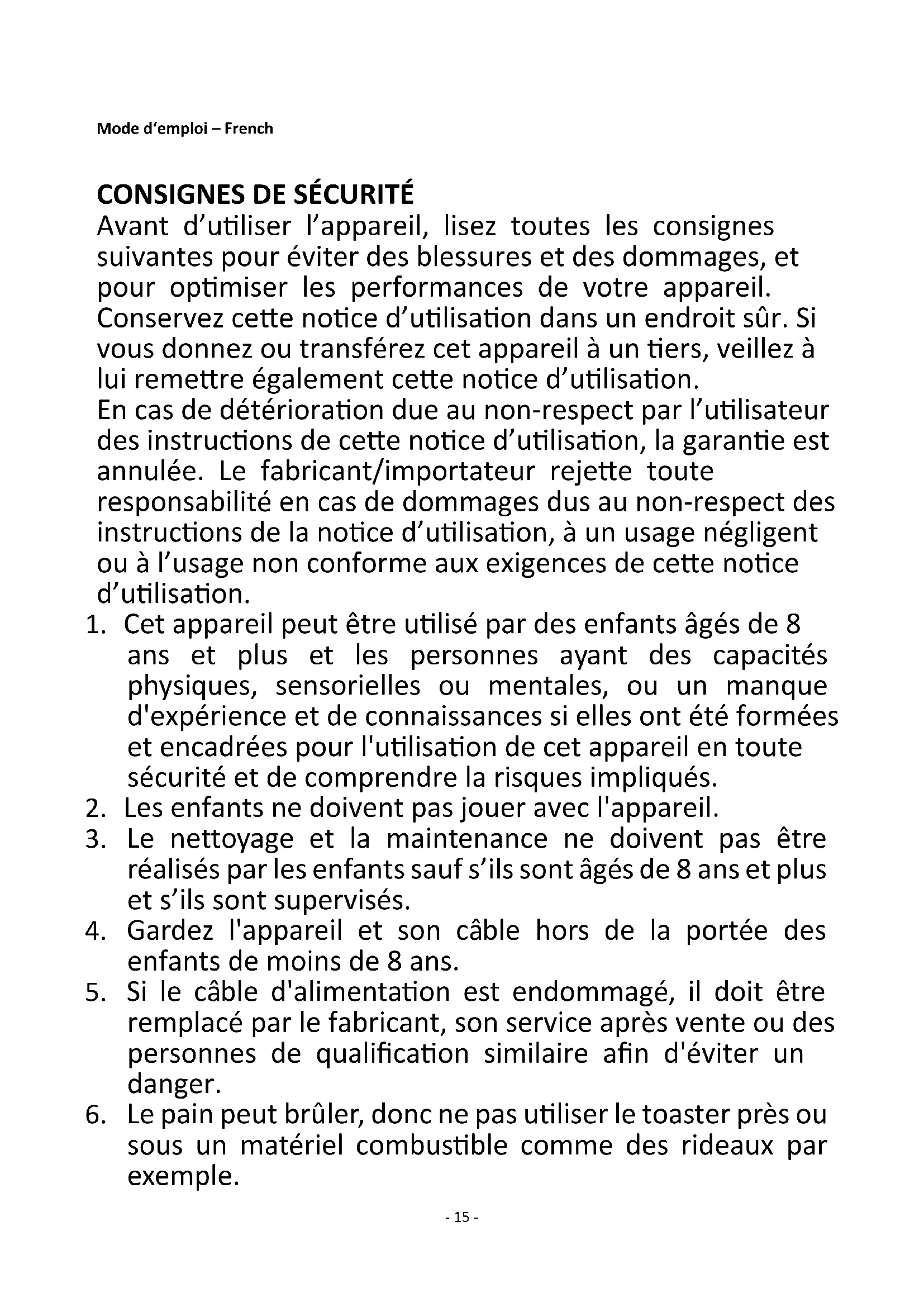 Avant d’utiliser l’appareil, lisez toutes les consignes suivantes pour éviter des blessures et des dommages, et pour optimiser les performances de votre appareil. Conservez cette notice d’utilisation dans un endroit sûr. Si vous donnez ou transférez cet appareil à un tiers, veillez à lui remettre également cette notice d’utilisation. En cas de détérioration due au non-respect par l’utilisateur des instructions de cette notice d’utilisation, la garantie est annulée. Le fabricant/importateur rejette toute responsabilité en cas de dommages dus au non-respect des instructions de la notice d’utilisation, à un usage négligent ou à l’usage non conforme aux exigences de cette notice d’utilisation.