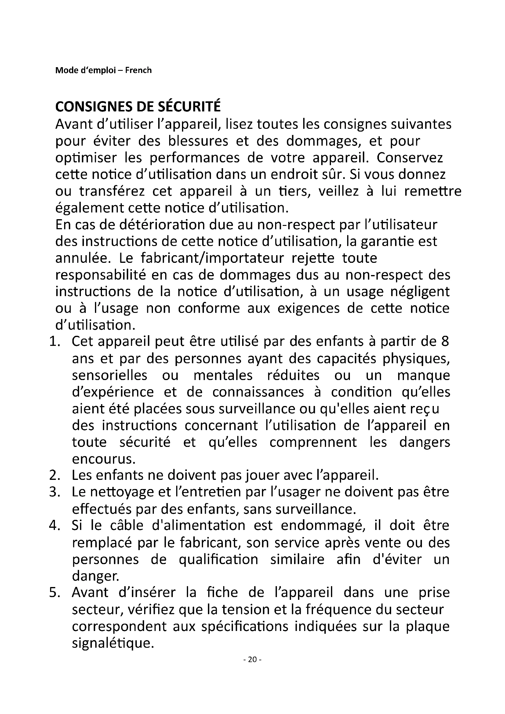 Avant d’utiliser l’appareil, lisez toutes les consignes suivantes pour éviter des blessures et des dommages, et pour optimiser les performances de votre appareil. Conservez cette notice d’utilisation dans un endroit sûr. Si vous donnez ou transférez cet appareil à un tiers, veillez à lui remettre également cette notice d’utilisation. En cas de détérioration due au non-respect par l’utilisateur des instructions de cette notice d’utilisation, la garantie est annulée. Le fabricant/importateur rejette toute responsabilité en cas de dommages dus au non-respect des instructions de la notice d’utilisation, à un usage négligent ou à l’usage non conforme aux exigences de cette notice d’utilisation.
