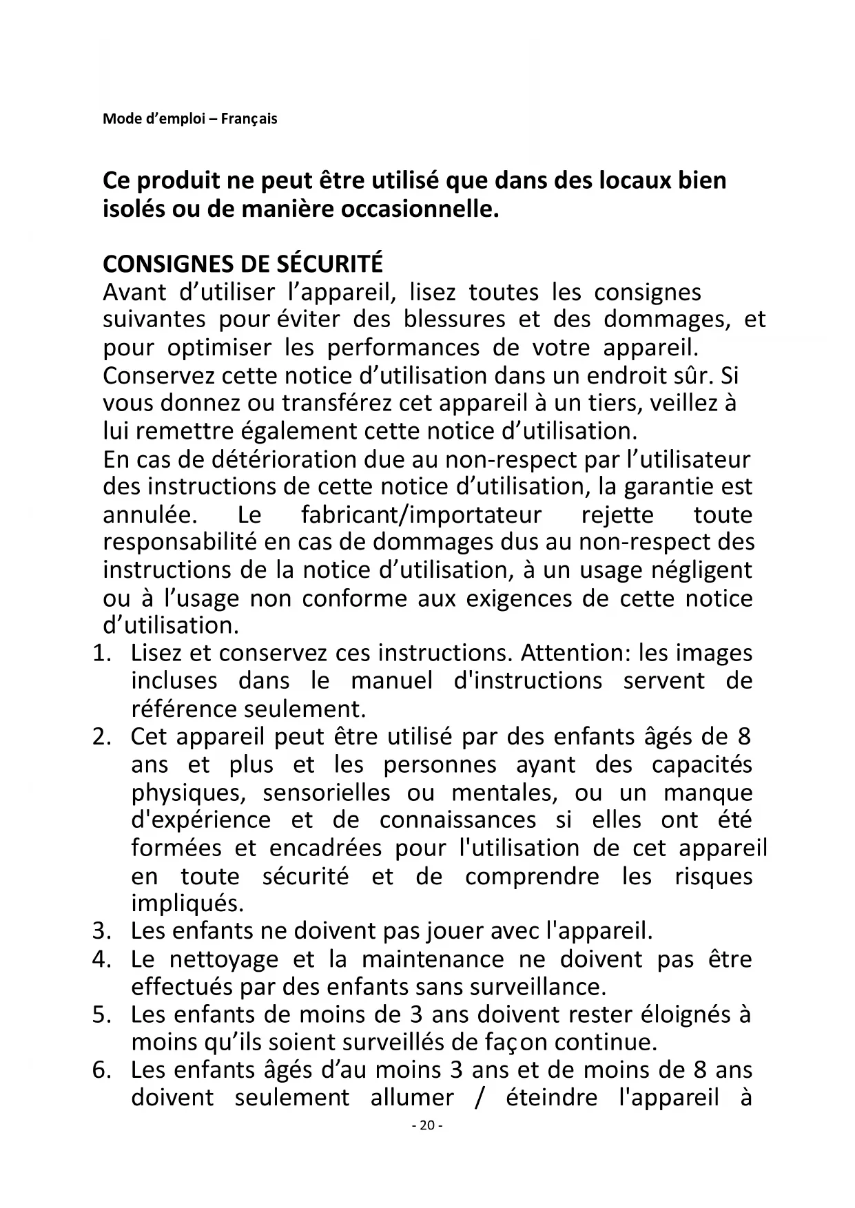 Avant d’utiliser l’appareil, lisez toutes les consignes suivantes pour éviter des blessures et des dommages, et pour optimiser les performances de votre appareil. Conservez cette notice d’utilisation dans un endroit sûr. Si vous donnez ou transférez cet appareil à un tiers, veillez à lui remettre également cette notice d’utilisation. En cas de détérioration due au non-respect par l’utilisateur des instructions de cette notice d’utilisation, la garantie est annulée. Le fabricant/importateur rejette toute responsabilité en cas de dommages dus au non-respect des instructions de la notice d’utilisation, à un usage négligent ou à l’usage non conforme aux exigences de cette notice d’utilisation.