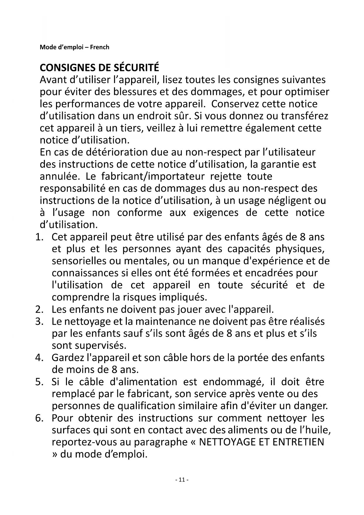 Avant d’utiliser l’appareil, lisez toutes les consignes suivantes pour éviter des blessures et des dommages, et pour optimiser les performances de votre appareil. Conservez cette notice d’utilisation dans un endroit sûr. Si vous donnez ou transférez cet appareil à un tiers, veillez à lui remettre également cette notice d’utilisation. En cas de détérioration due au non-respect par l’utilisateur des instructions de cette notice d’utilisation, la garantie est annulée. Le fabricant/importateur rejette toute responsabilité en cas de dommages dus au non-respect des instructions de la notice d’utilisation, à un usage négligent ou à l’usage non conforme aux exigences de cette notice d’utilisation.