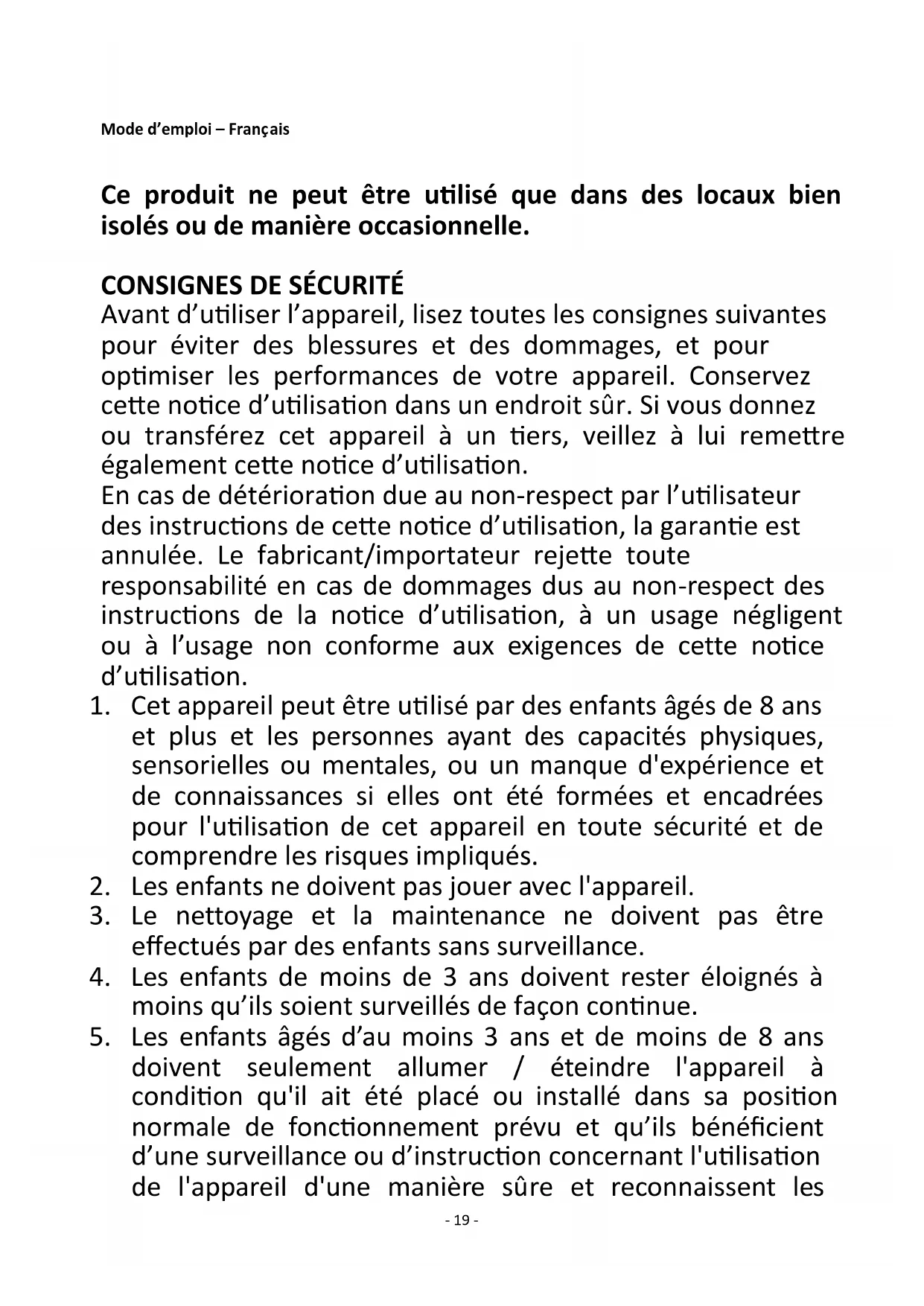 doivent seulement allumer / éteindre l'appareil à condition qu'il ait été placé ou installé dans sa position normale de fonctionnement prévu et qu’ils bénéficient d’une surveillance ou d’instruction concernant l'utilisation de l'appareil d'une manière sûre et reconnaissent les- 20 - risques encourus. Les enfants âgés d’au moins 3 ans et de moins de 8 ans ne doivent pas brancher, régler et nettoyer l'appareil ou d'effectuer l'entretien de l'utilisateur.