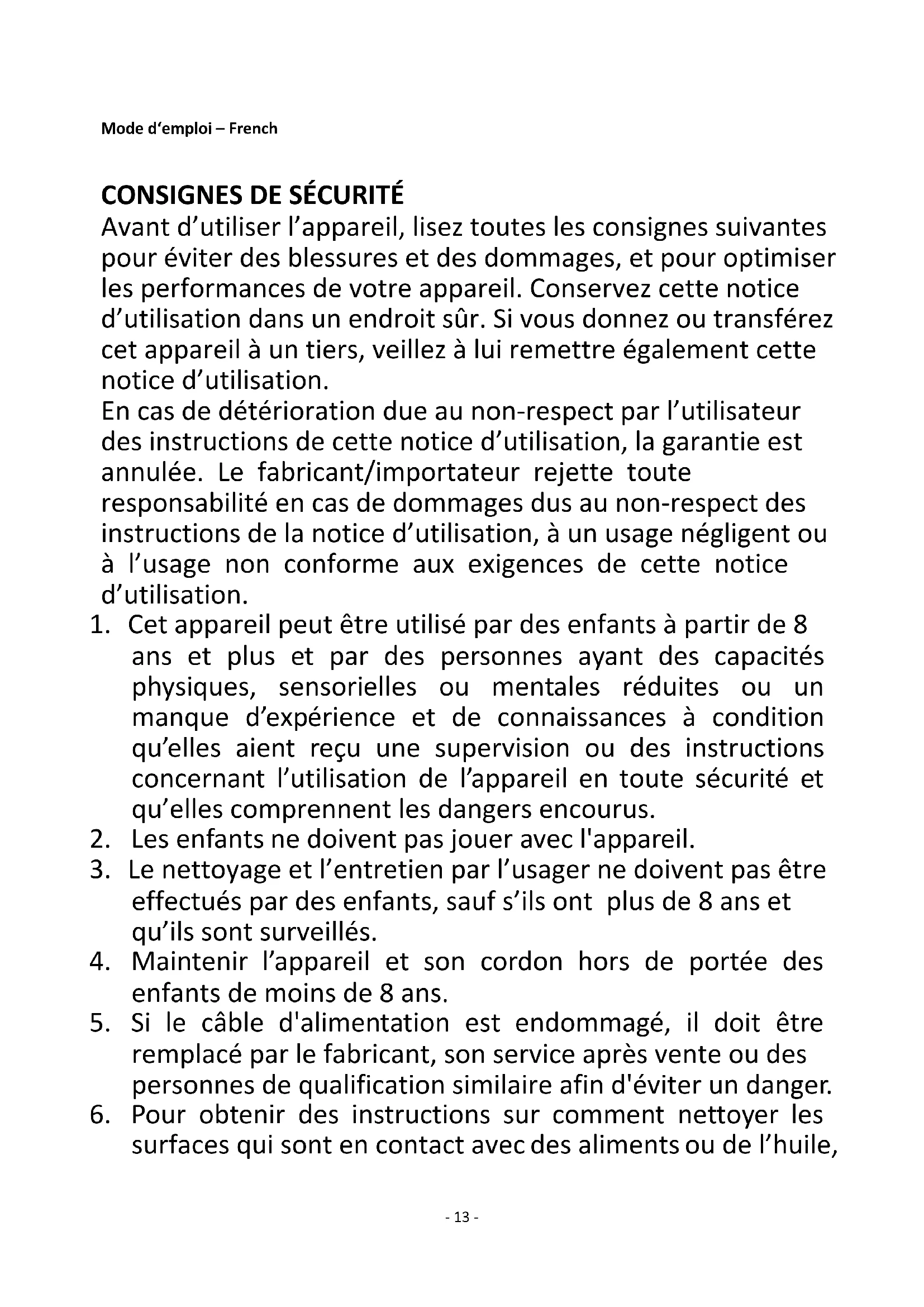 Avant d’utiliser l’appareil, lisez toutes les consignes suivantes pour éviter des blessures et des dommages, et pour optimiser les performances de votre appareil. Conservez cette notice d’utilisation dans un endroit sûr. Si vous donnez ou transférez cet appareil à un tiers, veillez à lui remettre également cette notice d’utilisation. En cas de détérioration due au non-respect par l’utilisateur des instructions de cette notice d’utilisation, la garantie est annulée. Le fabricant/importateur rejette toute responsabilité en cas de dommages dus au non-respect des instructions de la notice d’utilisation, à un usage négligent ou à l’usage non conforme aux exigences de cette notice d’utilisation.