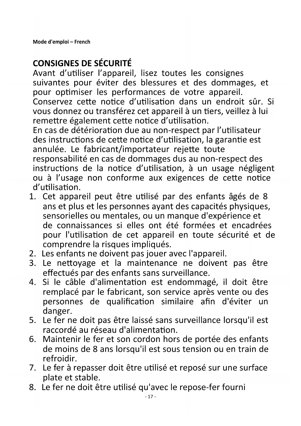 8. Le fer ne doit être utilisé qu'avec le repose-fer fourni- 18 -