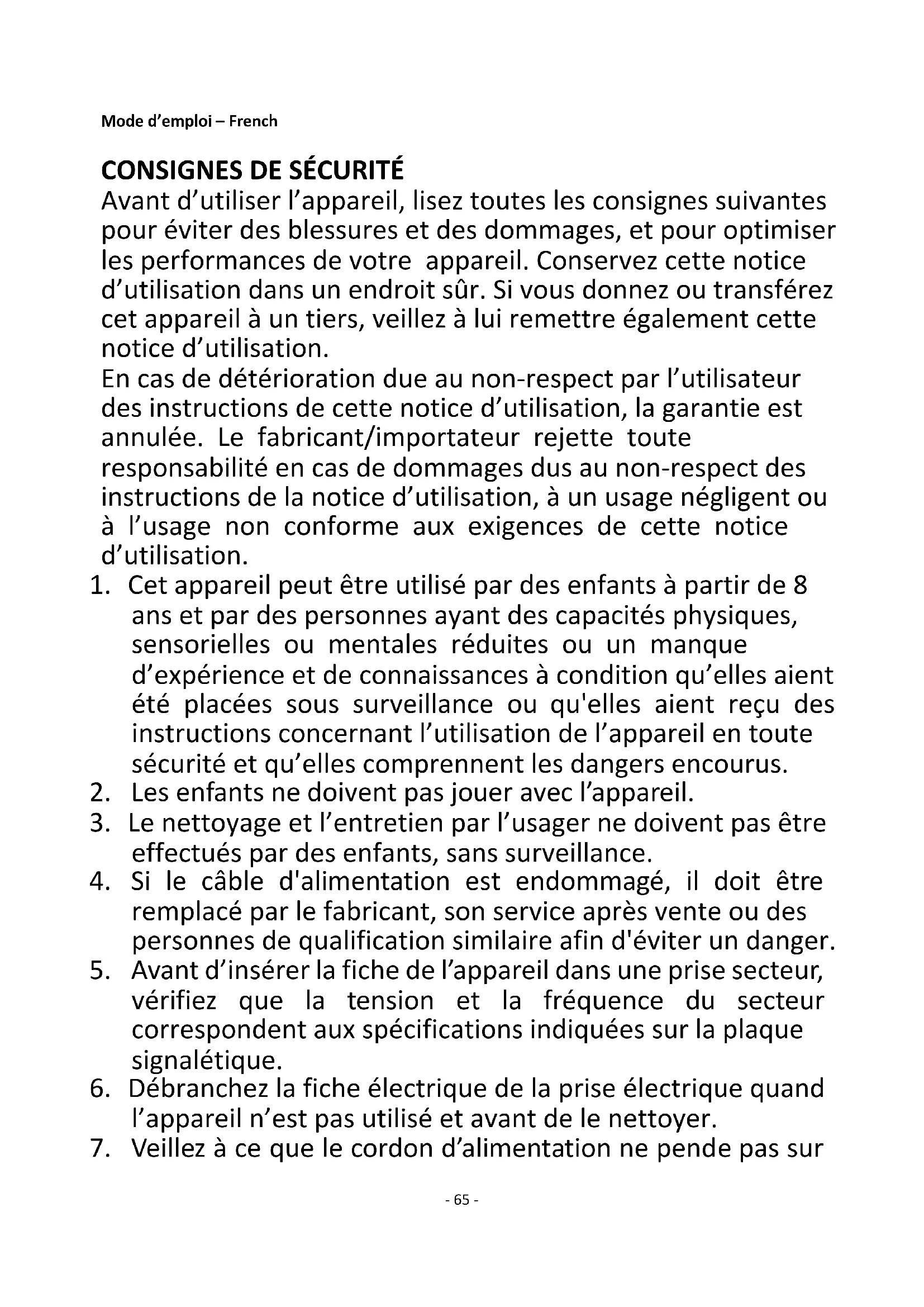 Avant d’utiliser l’appareil, lisez toutes les consignes suivantes pour éviter des blessures et des dommages, et pour optimiser les performances de votre appareil. Conservez cette notice d’utilisation dans un endroit sûr. Si vous donnez ou transférez cet appareil à un tiers, veillez à lui remettre également cette notice d’utilisation. En cas de détérioration due au non-respect par l’utilisateur des instructions de cette notice d’utilisation, la garantie est annulée. Le fabricant/importateur rejette toute responsabilité en cas de dommages dus au non-respect des instructions de la notice d’utilisation, à un usage négligent ou à l’usage non conforme aux exigences de cette notice d’utilisation.