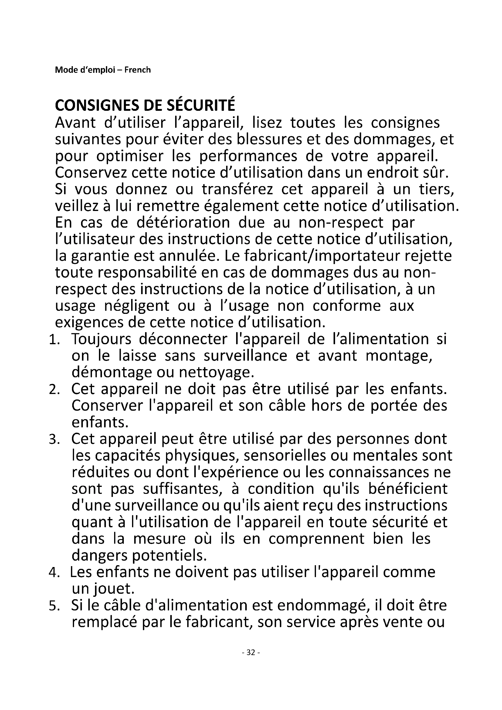 Avant d’utiliser l’appareil, lisez toutes les consignes suivantes pour éviter des blessures et des dommages, et pour optimiser les performances de votre appareil. Conservez cette notice d’utilisation dans un endroit sûr. Si vous donnez ou transférez cet appareil à un tiers, veillez à lui remettre également cette notice d’utilisation. En cas de détérioration due au non-respect par l’utilisateur des instructions de cette notice d’utilisation, la garantie est annulée. Le fabricant/importateur rejette toute responsabilité en cas de dommages dus au non- respect des instructions de la notice d’utilisation, à un usage négligent ou à l’usage non conforme aux exigences de cette notice d’utilisation.