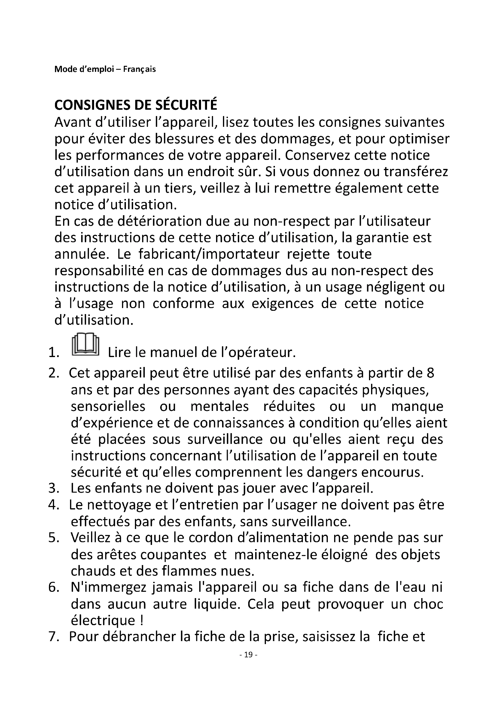 Avant d’utiliser l’appareil, lisez toutes les consignes suivantes pour éviter des blessures et des dommages, et pour optimiser les performances de votre appareil. Conservez cette notice d’utilisation dans un endroit sûr. Si vous donnez ou transférez cet appareil à un tiers, veillez à lui remettre également cette notice d’utilisation. En cas de détérioration due au non-respect par l’utilisateur des instructions de cette notice d’utilisation, la garantie est annulée. Le fabricant/importateur rejette toute responsabilité en cas de dommages dus au non-respect des instructions de la notice d’utilisation, à un usage négligent ou à l’usage non conforme aux exigences de cette notice d’utilisation.