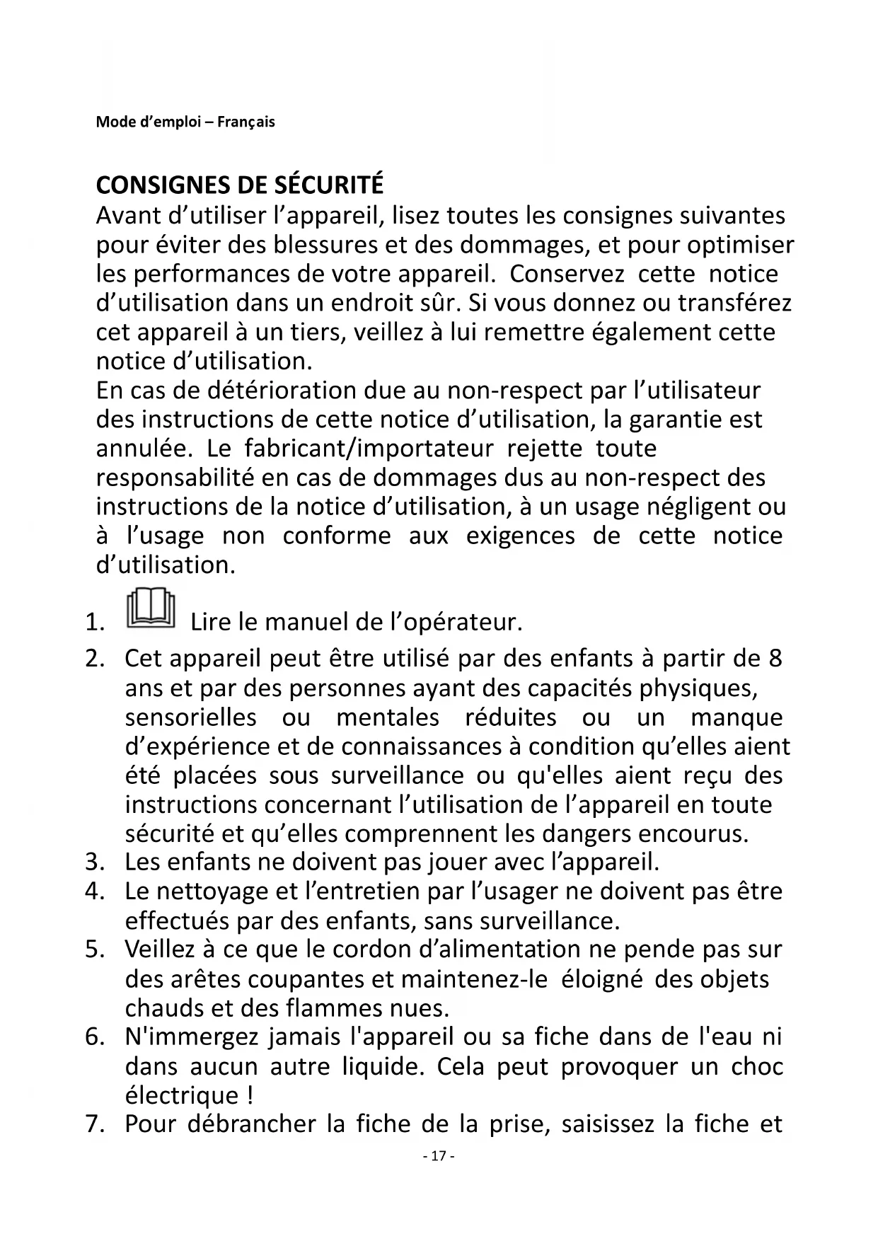 Avant d’utiliser l’appareil, lisez toutes les consignes suivantes pour éviter des blessures et des dommages, et pour optimiser les performances de votre appareil. Conservez cette notice d’utilisation dans un endroit sûr. Si vous donnez ou transférez cet appareil à un tiers, veillez à lui remettre également cette notice d’utilisation. En cas de détérioration due au non-respect par l’utilisateur des instructions de cette notice d’utilisation, la garantie est annulée. Le fabricant/importateur rejette toute responsabilité en cas de dommages dus au non-respect des instructions de la notice d’utilisation, à un usage négligent ou à l’usage non conforme aux exigences de cette notice d’utilisation.