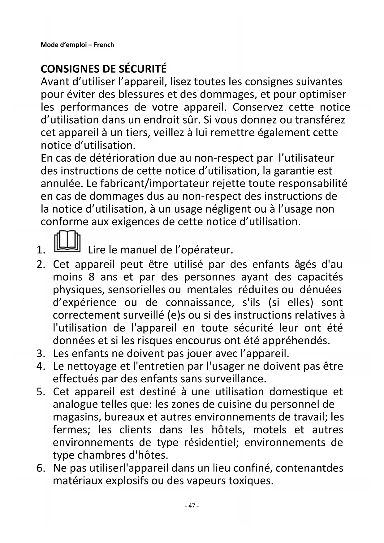 Avant d’utiliser l’appareil, lisez toutes les consignes suivantes pour éviter des blessures et des dommages, et pour optimiser les performances de votre appareil. Conservez cette notice d’utilisation dans un endroit sûr. Si vous donnez ou transférez cet appareil à un tiers, veillez à lui remettre également cette notice d’utilisation. En cas de détérioration due au non-respect par l’utilisateur des instructions de cette notice d’utilisation, la garantie est annulée. Le fabricant/importateur rejette toute responsabilité en cas de dommages dus au non-respect des instructions de la notice d’utilisation, à un usage négligent ou à l’usage non conforme aux exigences de cette notice d’utilisation.