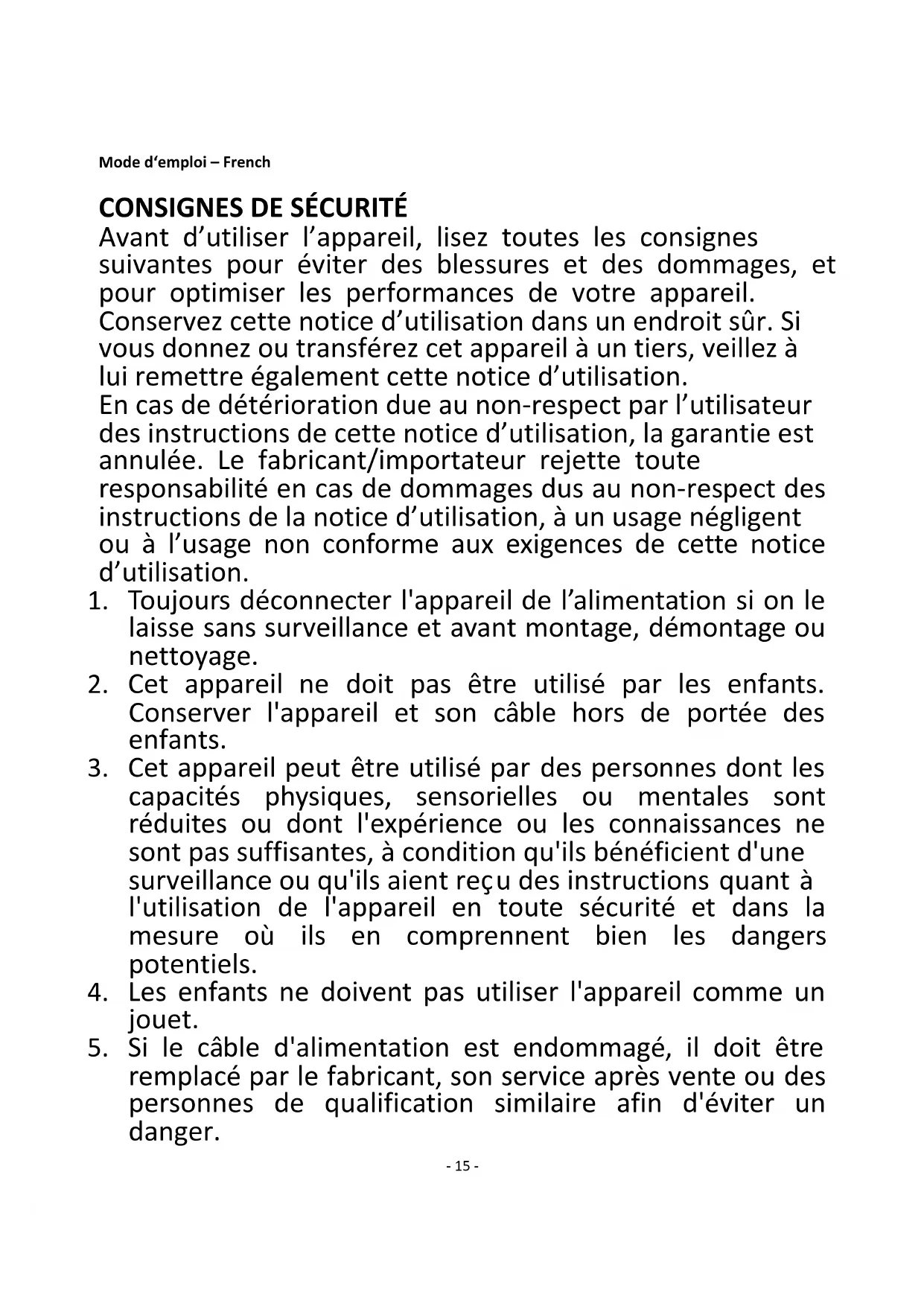 Avant d’utiliser l’appareil, lisez toutes les consignes suivantes pour éviter des blessures et des dommages, et pour optimiser les performances de votre appareil. Conservez cette notice d’utilisation dans un endroit sûr. Si vous donnez ou transférez cet appareil à un tiers, veillez à lui remettre également cette notice d’utilisation. En cas de détérioration due au non-respect par l’utilisateur des instructions de cette notice d’utilisation, la garantie est annulée. Le fabricant/importateur rejette toute responsabilité en cas de dommages dus au non-respect des instructions de la notice d’utilisation, à un usage négligent ou à l’usage non conforme aux exigences de cette notice d’utilisation.