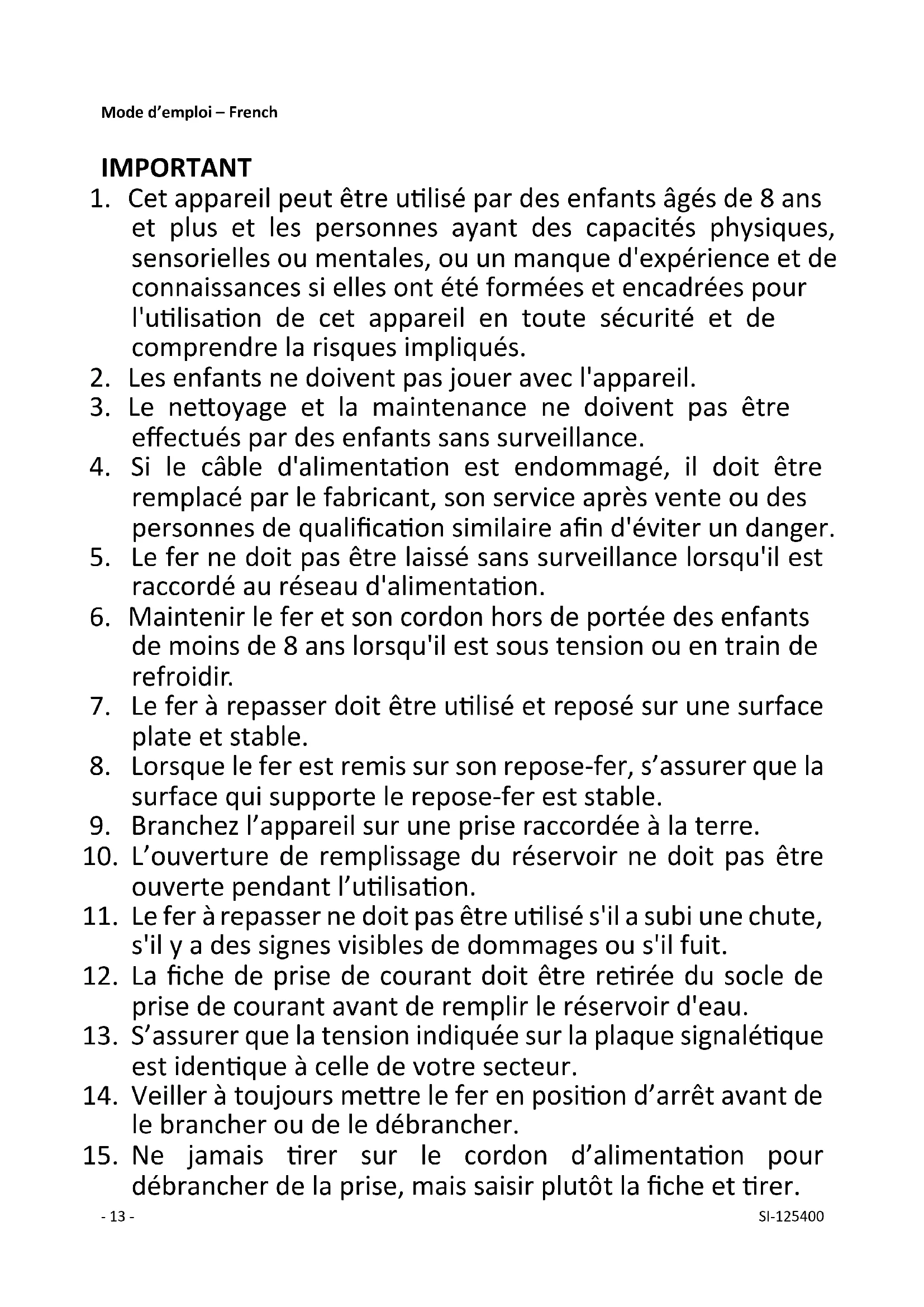 débrancher de la prise, mais saisir plutôt la fiche et tirer.- 14 - SI-125400