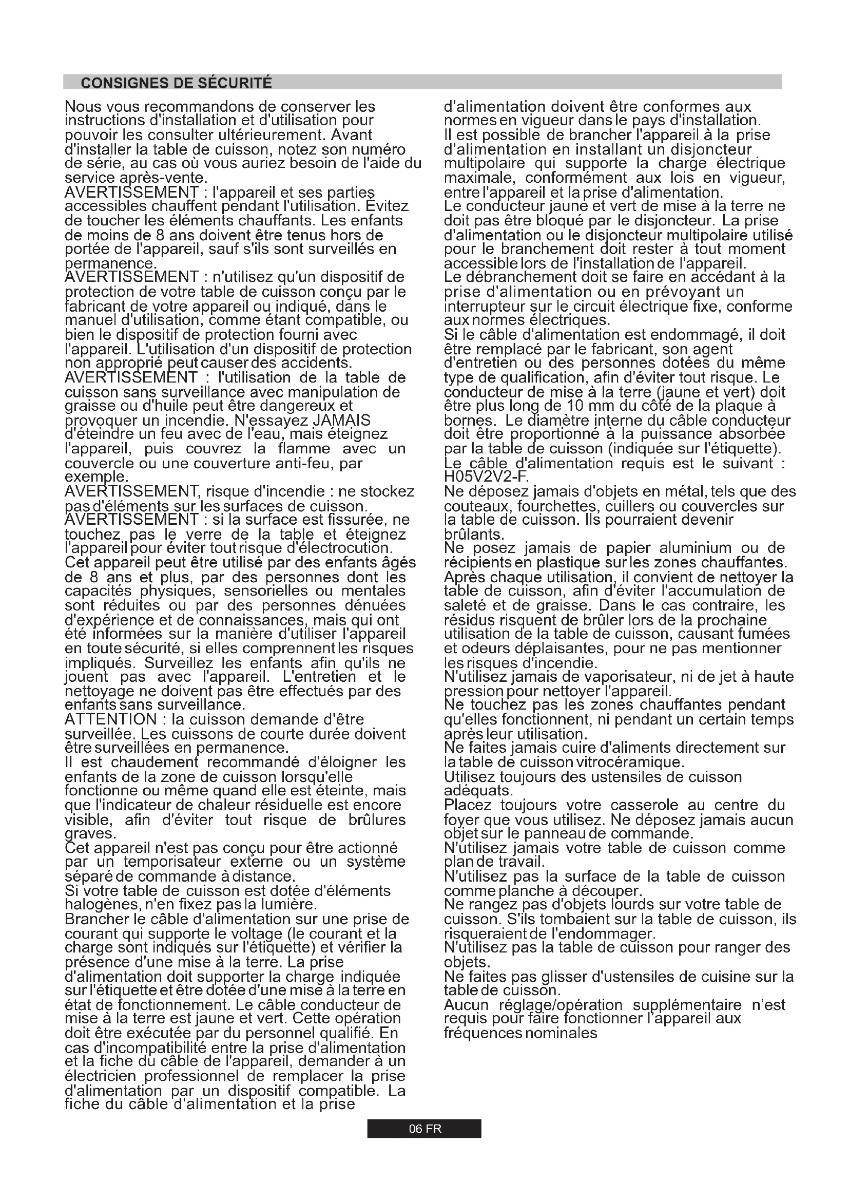 touchez pas le verre de la table et éteignez l'appareil pour éviter tout risque d'électrocution. Cet appareil peut être utilisé par des enfants âgés de 8 ans et plus, par des personnes dont les capacités physiques, sensorielles ou mentales sont réduites ou par des personnes dénuées d'expérience et de connaissances, mais qui ont été informées sur la manière d'utiliser l'appareil en toute sécurité, si elles comprennent les risques impliqués. Surveillez les enfants afin qu'ils ne jouent pas avec l'appareil. L'entretien et le nettoyage ne doivent pas être effectués par des enfants sans surveillance. ATTENTION : la cuisson demande d'être surveillée. Les cuissons de courte durée doivent être surveillées en permanence. Il est chaudement recommandé d'éloigner les enfants de la zone de cuisson lorsqu'elle fonctionne ou même quand elle est éteinte, mais que l'indicateur de chaleur résiduelle est encore visible, afin d'éviter tout risque de brûlures graves. Cet appareil n'est pas conçu pour être actionné par un temporisateur externe ou un système séparé de commande à distance. Si votre table de cuisson est dotée d'éléments halogènes, n'en fixez pas la lumière. Brancher le câble d'alimentation sur une prise de courant qui supporte le voltage (le courant et la charge sont indiqués sur l'étiquette) et vérifier la présence d'une mise à la terre. La prise d'alimentation doit supporter la charge indiquée sur l'étiquette et être dotée d'une mise à la terre en état de fonctionnement. Le câble conducteur de mise à la terre est jaune et vert. Cette opération doit être exécutée par du personnel qualifié. En cas d'incompatibilité entre la prise d'alimentation et la fiche du câble de l'appareil, demander à un électricien professionnel de remplacer la prise d'alimentation par un dispositif compatible. La fiche du câble d'alimentation et la prise
